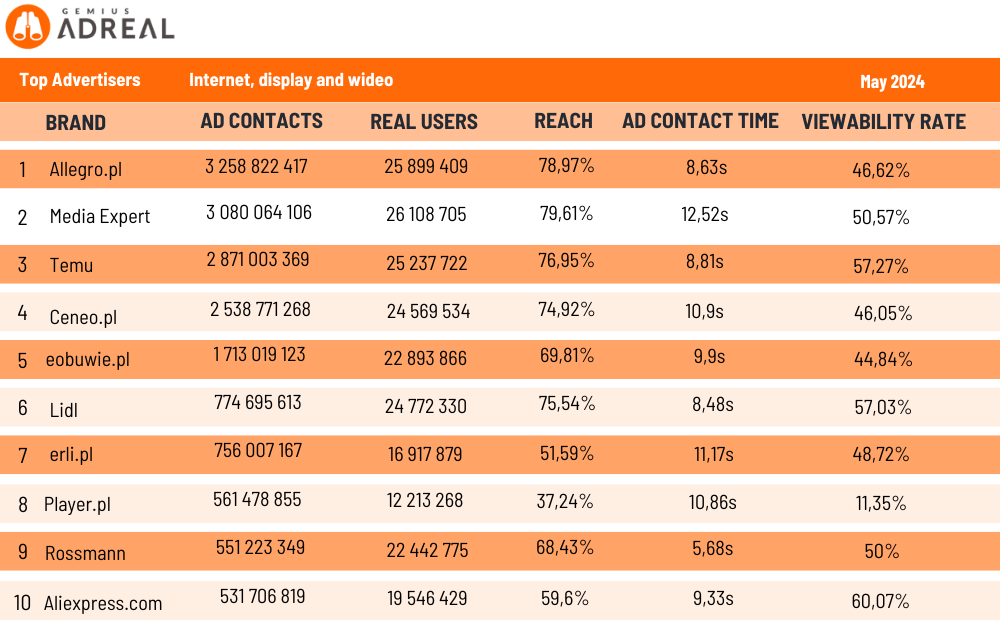 The most active digital advertiser in May 2024 was the Allegro.pl brand, which generated 3.26 billion online advertising contacts, reaching 78.97% of Poles aged 7 to 75. In second place was Media Expert with 3.08 billion contacts and 79.61% reach. Third place on the podium belonged to Temu (2.87 billion contacts and 76.95% reach).