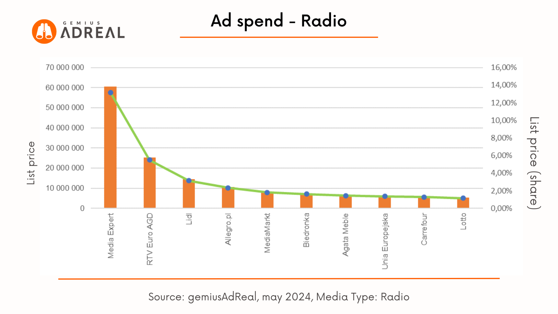 The Media Expert brand had the highest share of radio ad spending in May (13.85%). Next places belong to RTV Euro AGD (5.80%) and Lidl (3.30%).