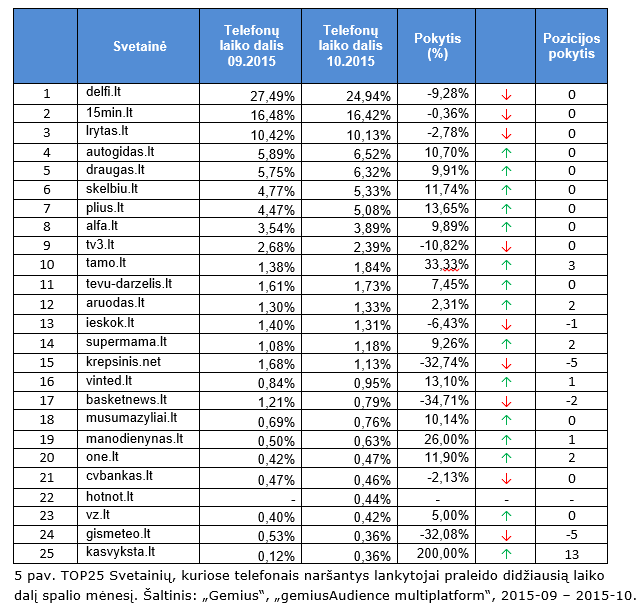 Trumpiau telefonų naudotojus svetainėje išlaikė basketnews.lt (-34,71%), krepsinis.net (-32,74%) ir gismeteo.lt (-32,08%).