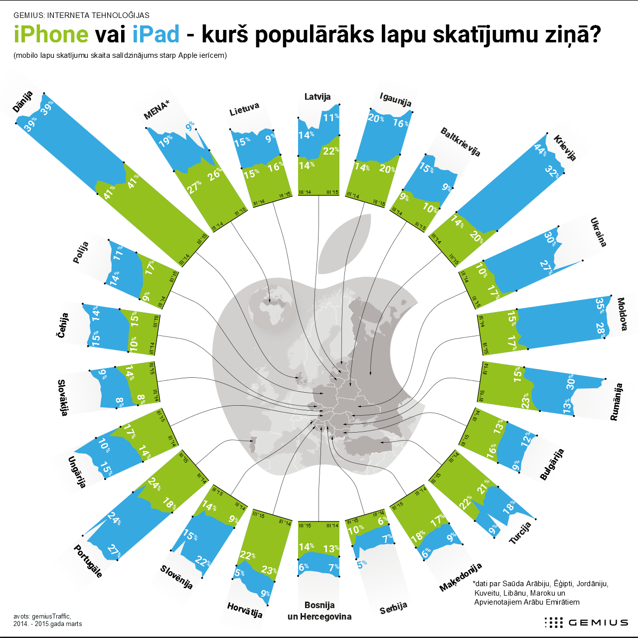 Kā rāda gemiusTraffic dati, Latvijā 33 procenti no visiem mobilo lapu skatījumiem nāk no Apple ierīcēm. Tajā skaitā no iPhone tiek veikti 22 procenti no visiem mobilajiem lapu skatījumiem, kamēr no iPad – 11 procenti. Salīdzinot ar situāciju pirms gada, lietotāji aktīvāk pārlūko internetu no iPhone - lapu skatījumu skaits pieaudzis par 8 procentiem. Lai arī no iPad veikto mobilo lapu skatījumu daļa gada laikā ir kritusi par trīs procentiem, Apple mobilo ierīču popularitāte starp Latvijas interneta lietotājiem nav zudusi – salīdzinot ar 2014.gadu, šī gada martā no Apple ierīcēm kopā veikti par 5 procentiem vairāk lapu skatījumi.