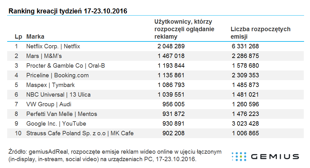 Na pierwszym miejscu najpopularniejszych reklam znalazła się propozycja platformy Netflix. Tym razem zamiast losów Pablo Escobara, player proponuje produkcję na podstawie komiksów Marvela. Luke Cage to historia współczesnego Robin Hooda, który na własną rękę wymierza sprawiedliwość nękającym Harlem przestępcom. Utrzymany w klimatach kina gangsterskiego trailer zanotował dotarcie do ponad 2 mln realnych użytkowników i 6,3 mln emisji (źródło: www.adreal.gemius.com). Wideo było emitowane wyłącznie za pośrednictwem portalu Facebook, gdzie po raz pierwszy pojawiło się 22 września.
