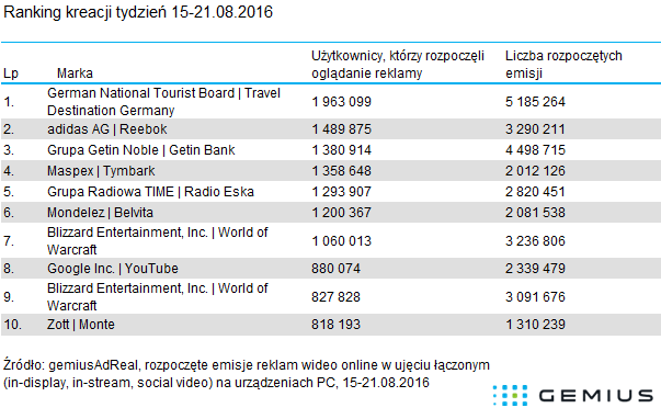 Na pierwszym miejscu zestawienia znalazł się spot Niemieckiej Centrali Turystyki będący elementem akcji promocyjnej 'Niemcy ─ cel podróży'. Reklama kusząca letnimi urokami Niemiec zadebiutowała 10 sierpnia i była emitowana na portalach Onet.pl, Sport.pl, WP.pl oraz Kwejk.pl. Spot zanotował 2 mln realnych użytkowników przy ponad 5 mln emisji (źródło: gemiusAdReal).