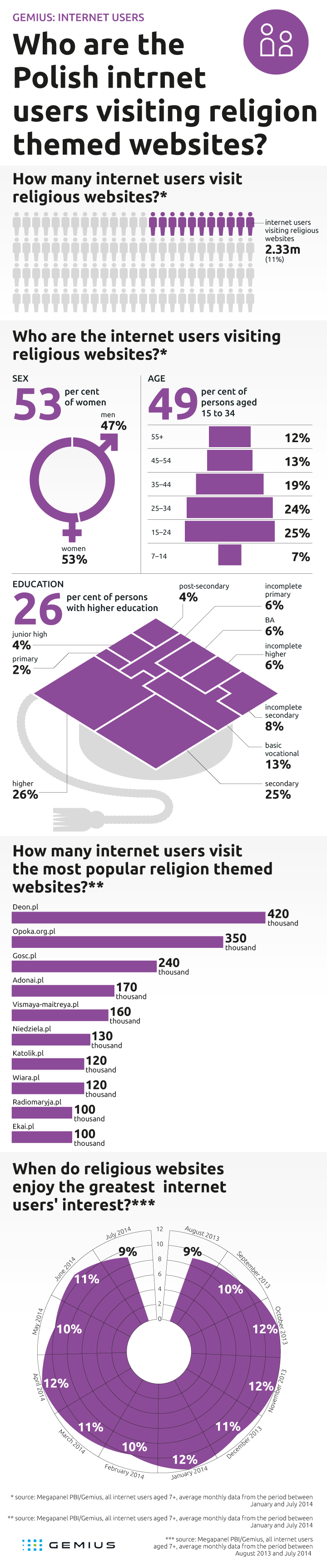 In early November Poles traditionally visit the graves of their deceased loved ones. In that time media devote a lot of their time to discuss the existential questions of life and death. This is also when issues related to faith are brought up more often. Gemius analysts have decided to study religious websites. Which of them are most popular? Who are the internet users who seek content related to creed? When do such religious websites get most interest? These questions have found their answers in the infographics prepared by Gemius.
