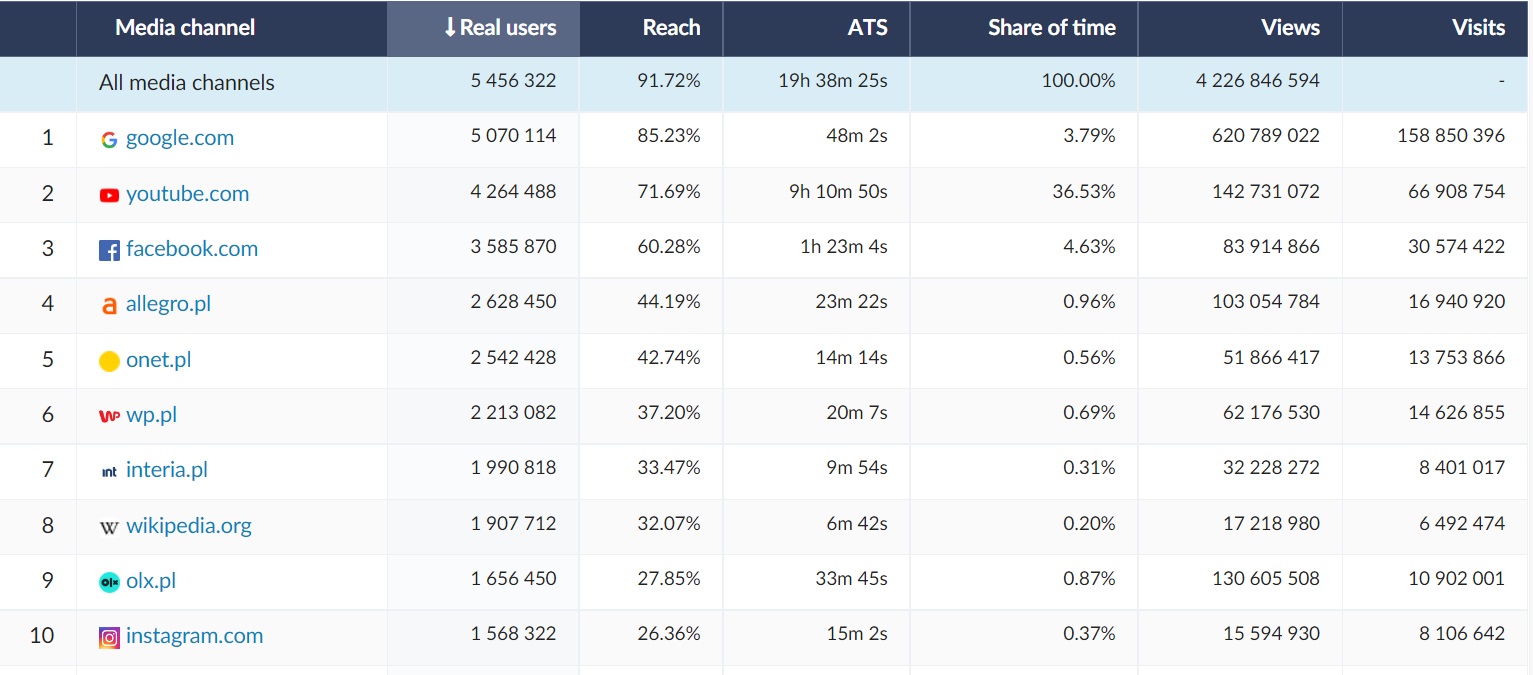 Mediapanel is the first cross-media study in Poland based on a single source. The study combines site-centric measurement (measurement scripts at the site and application level) and user-centric measurement (panelists' behavior). In the production of data, we use proprietary, internationally recognized methodologies and algorithms. The Mediapanel study provides a complete and reliable picture of the Polish online market. It offers the possibility of analyzing and comparing the viewership of websites, applications and streaming materials on various types of devices, optimization of advertising budgets, comparison of traffic on desktops and laptops at home (PC-home) and at work (PC-work), as well as determining the position of the entity and its competition.
