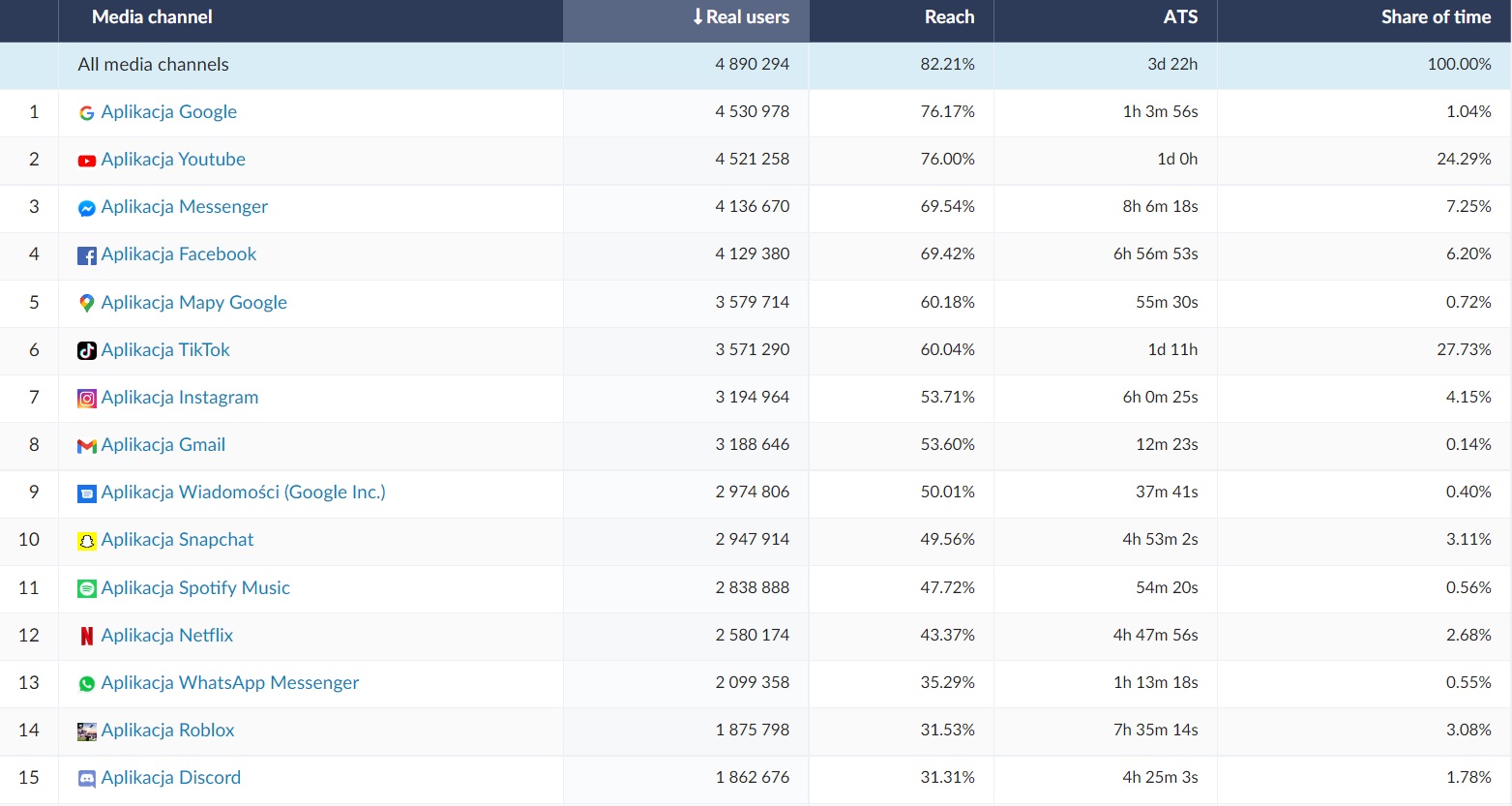 In the 15 most popular applications among the pupil / student group in analysed period, the same as a year ago, the leading ones were Google, YouTube, Messanger and Facebook. Instagram and TikTok were also in the top 10. TikTok, the same as in 2021, is the undeniable leader when it comes to ATS. The average time spent by each user in this application in analysed period was 1 day and 11 hours (in 2021 it was 24 hours). However, this time Tiktok can feel the competition on his heels - YouTube is chasing him with the result of ATS equal 24 hours. TikTok with its ATS result dethroned also applications such as Facebook (ATS = almost 7h), Messanger (ATS = 8h) and Instagram (ATS = 6h). This is an important tip for advertisers who want to reach the age group 7 – 24 with their advertising message. In this target group TikTok is the most popular today, often overtaking Facebook or Instagram. There is also a noticeable increase in popularity among this age group compared to last year.