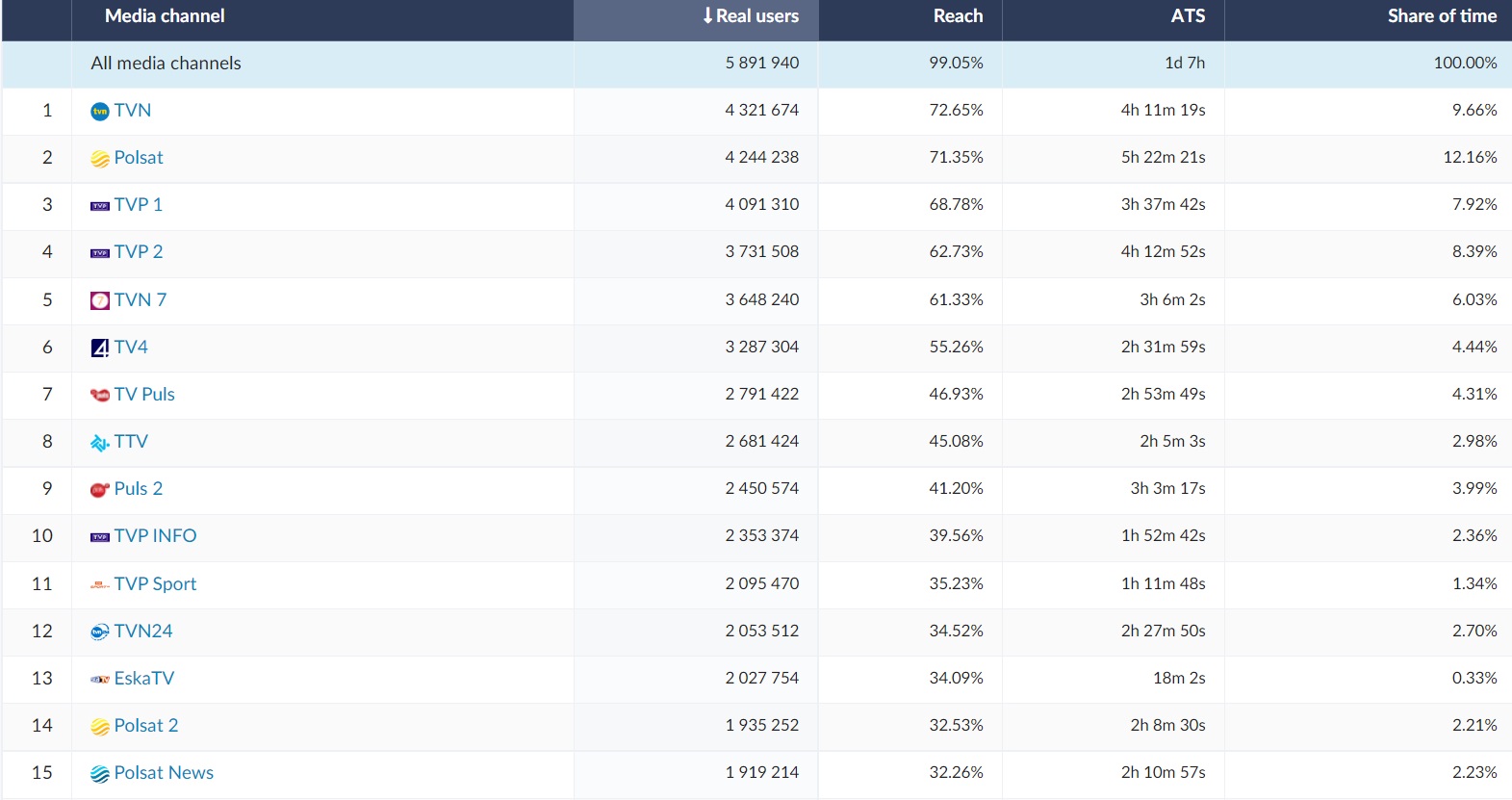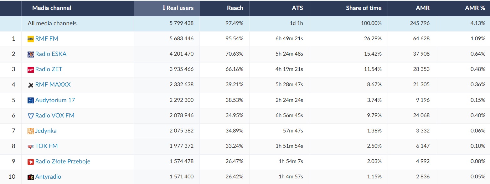 On the list of the 15 most popular TV stations the leader in analysed period, the same as year ago, was TVN (4,3 million Real Users and the highest reach - over 70%). The top ten also included TVN7 and TTV - the Discovery group channels, whose target group is the younger part of the audience (teenagers and young adults). Except that, the same as year ago, Polsat and TVP1 are on the podium. This year, only one music station was included in the list of the 15 most popular TV stations - Eska TV.