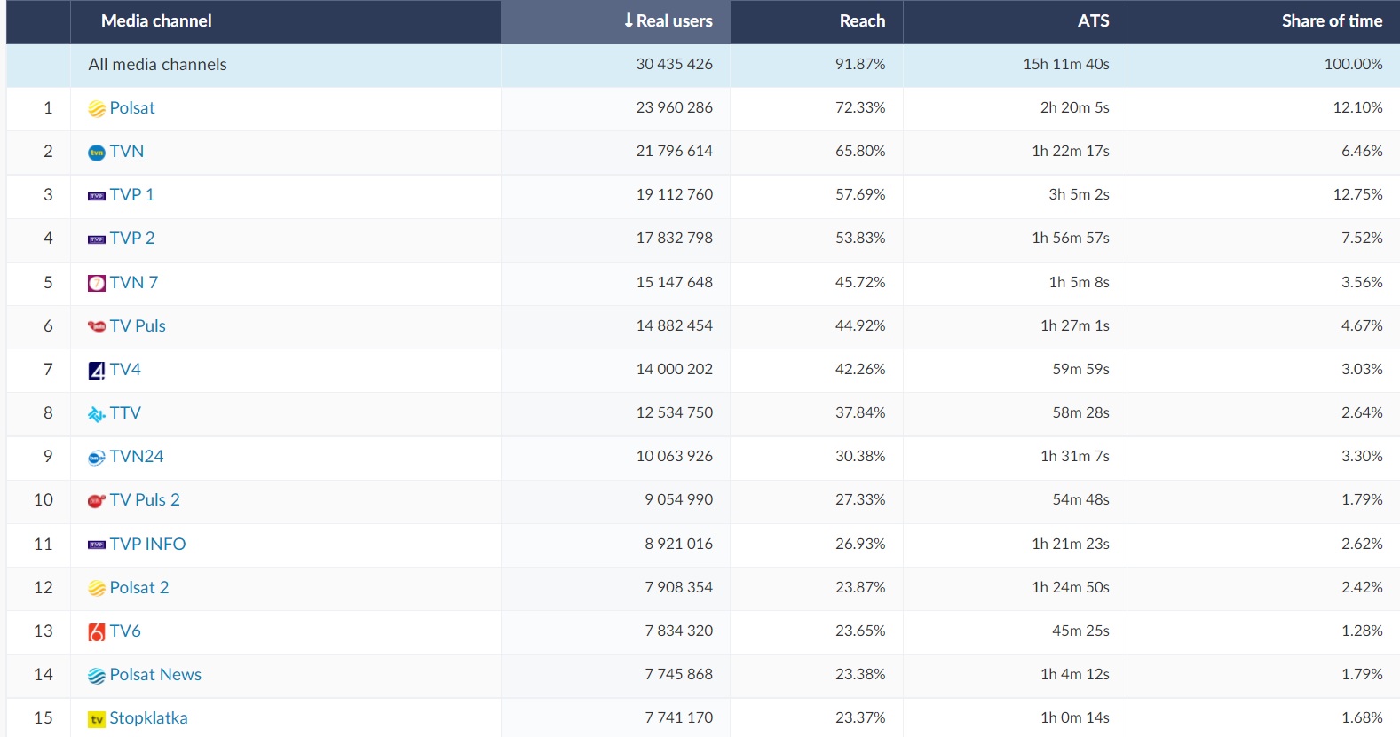 The TVN tv station achieved second place with almost 22 million real users and a reach of almost 66%. The average time spent by the viewer watching the station (ATS) was almost 1.5 hours. On the Christmas Eve, TVN focused on broadcasting Christmas polish hit Listy do M (Letters to M), on December 25 viewers could watch The Fate of the Furious (8th part of The Fast and Furious), and on the second day of Christmas - the 2nd part of Listy do M (Letters to M) and How the Grinch Stole Christmas.