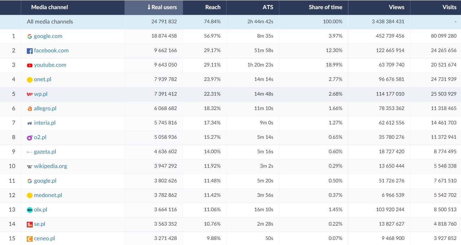 On the list of the 15 most popular websites on December 24-26, facebook.com and youtube.com were on the podium, as well as the google.com browser. It can therefore be noticed that during the holiday season, Poles were eager to contact their relatives via social media. In the analyzed period the Facebook website was used by almost 10 million real users. Each of them spent almost an hour (ATS) on the site. Poles also eagerly used the YouTube music service. The website was visited by almost 10 million real users and the ATS was almost 1.5 hours.