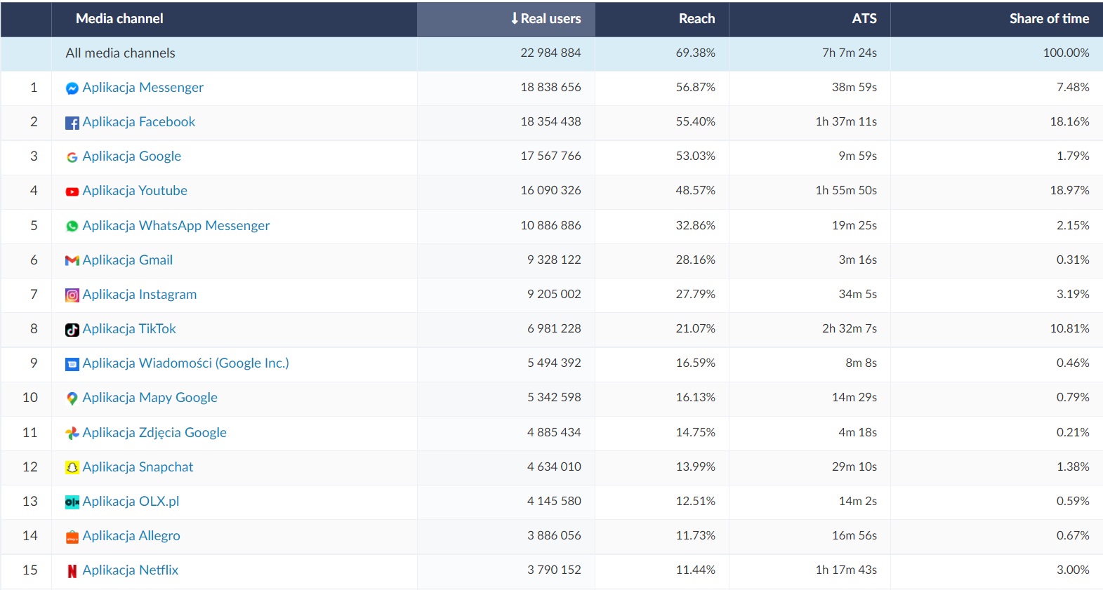 On the list of the 15 most popular applications during December 24-26, Messenger, Facebook and Google were on the podium. Almost 19 million real users used Messenger during the holiday season. Each of them spent almost 40 minutes (ATS) in the application. A comparable number of users used the Facebook application for a much longer time (ATS equal 1h 40min). WhatsApp Messenger and Gmail applications were also popular, which indicates that in the analyzed period Poles were eager to contact their relatives and friends. The great interest in the Google Maps application indicates frequent travels in the analyzed period. As usual, the list of the most popular applications includes social media (Facebook - 2nd place, Instagram - 7, TikTok - 8 and Snapchat - 12).