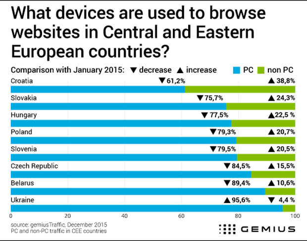 The general changes over the year are nothing spectacular. Although the share of mobile devices in generating hits is growing, the growth rate in 2015 was not particularly fast. According to Gemius data, the biggest increase in mobile traffic was recorded in Croatia. Meanwhile, in Ukraine, traffic from tablets and smartphones has declined since January 2015, with just 4.3 per cent of traffic coming from mobile devices.
