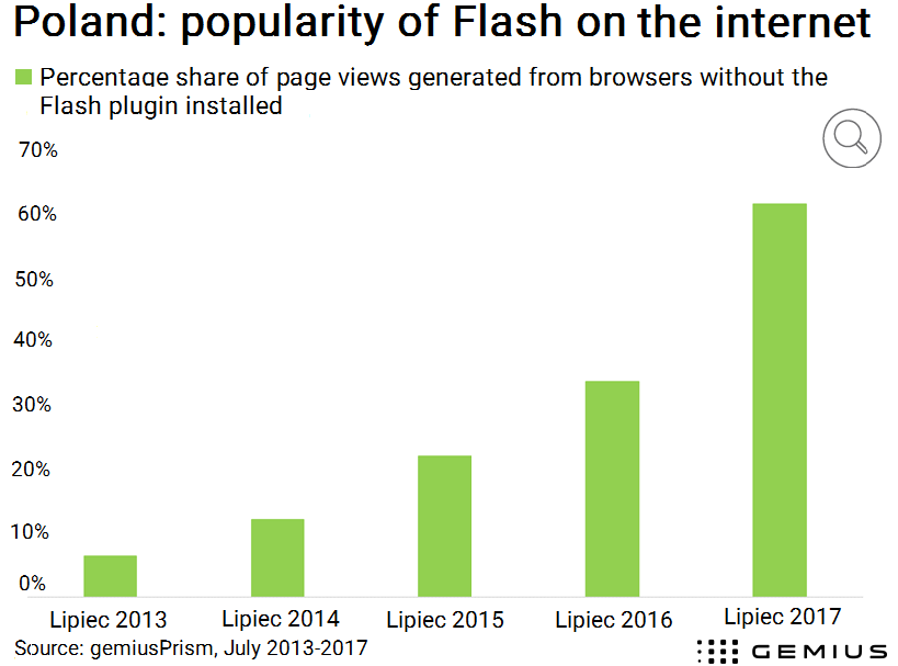 The data collected shows that the departure from this technology has been gradual, but decisive. Over the last five years, the number of Polish websites’ page views generated by browsers without Flash has risen from 6.4 per cent in July 2013 to 61.5 per cent in July 2017 (source: gemiusPrism).