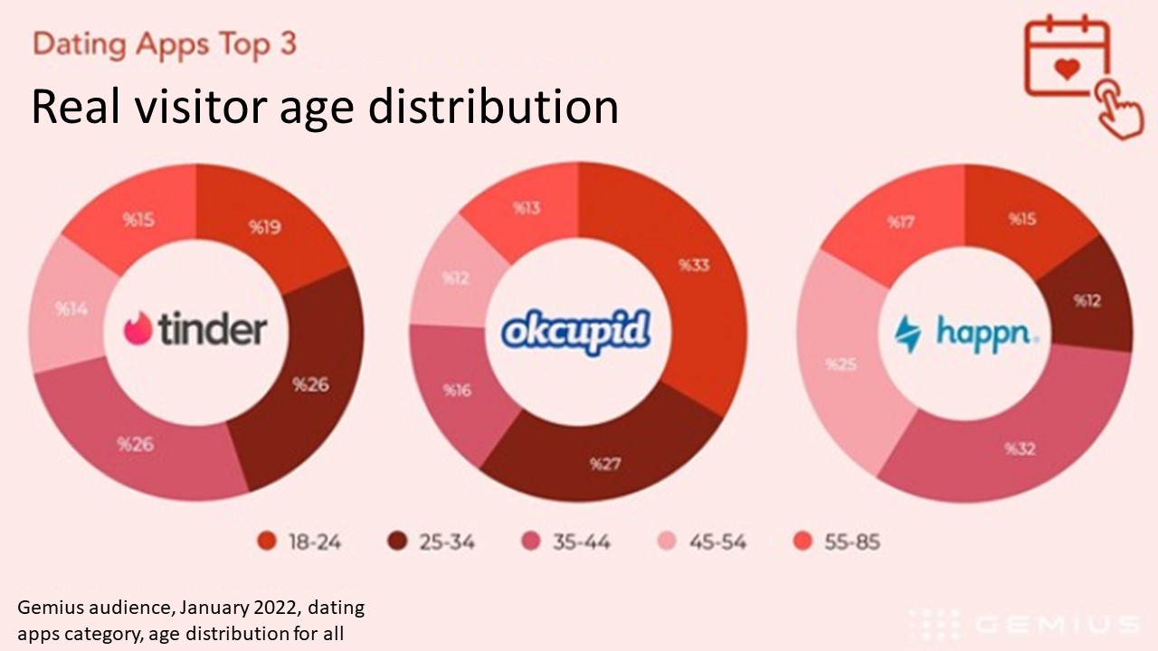 Tinder was the application that noted the most visitors in January 2022. With 3.9 million real users, Tinder is followed by OkCupid with 2.6 million and Happn with 1.3 million. When we look at the average time spent per person, it is remarkable that Tinder users spent more time using the application (1 hour and 25 minutes), while on the other apps users spent 37 minutes (OkCupid) and 20 minutes (Happn). There are significant differences between the user bases of Tinder, Happn and OkCupid, which attract great attention in Turkey. We see that Tinder is predominantly made up of users between the ages of 25-44. While the 35-44 age range predominates in Happn. The average age of the users is decreasing in OkCupid and it is noteworthy that the 18-24 age range stands out.