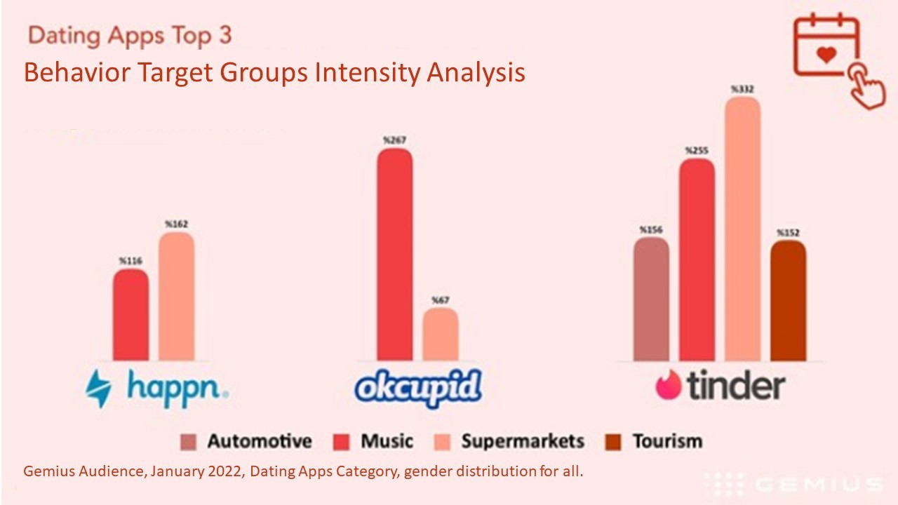 Tinder, Happn and OkCupid noted significant differences based on their users in the analysed period. Tinder users also prefer to consume online music apps and do their shopping mostly through supermarket applications.