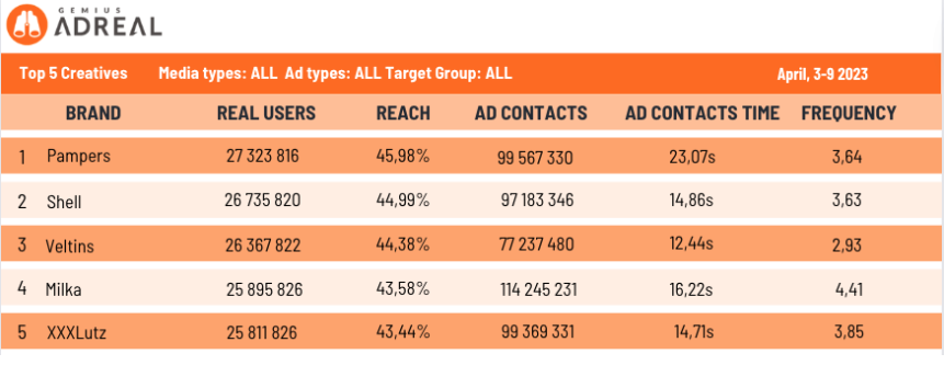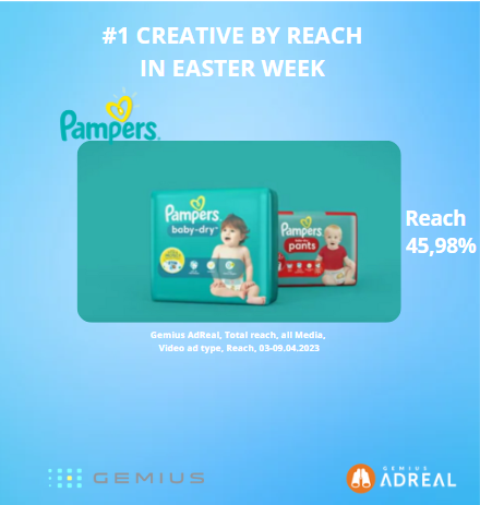 According to recent data from gemiusAdreal, Pampers brand video creative got the highest reach during the Easter week of April 3-9. Pampers creative as a well-known brand in the baby care industry, was able to achieve an impressive total reach of 46%.