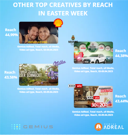 Following closely behind Pampers was Shell, a well-known energy and petroleum company, achieving the second-highest score during this period with their video creative with nearly 45% of reach. The third brand on the podium was Veltins, a German beer brand, with their video advertisement reaching 44.38% of general audience. Veltins's marketing approach emphasized the quality and tradition of their beer, as well as their commitment to responsible drinking. Milka video creative, a popular chocolate brand, was the fourth highest with a total reach of 43.58% in Easter week. Also Milka’s creative has deep social social and thematic scenario that reminds us of important values in life. Finally, XXXLutz, a furniture retailer, achieved a total reach of 43.44% on all platforms with their video ad.