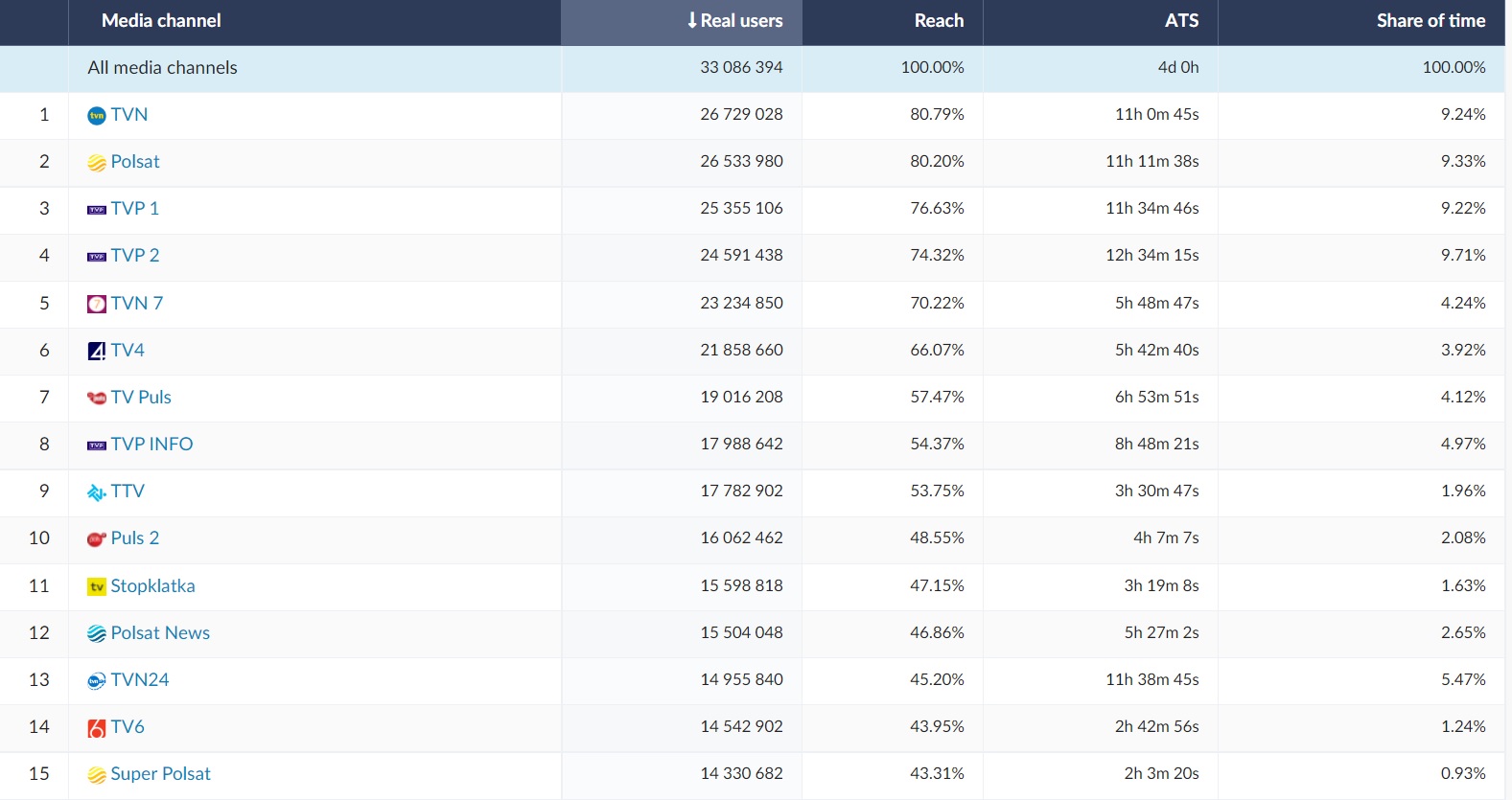 In October, TVN (Real Users = 26,7 million; Reach = 80,79%), Polsat (Real Users = 26,5 million; Reach = 80,20%) and TVP 1 (Real Users = 25,3 million; Reach = 76,6%) were on the podium of the most popular TV stations in Poland. Poles also eagerly watched TV news stations (TVP INFO, TVN24, Polsat News). The longest ATS (Average Time Spent) was recorded by TVP 2, TVN24 and TVP1.