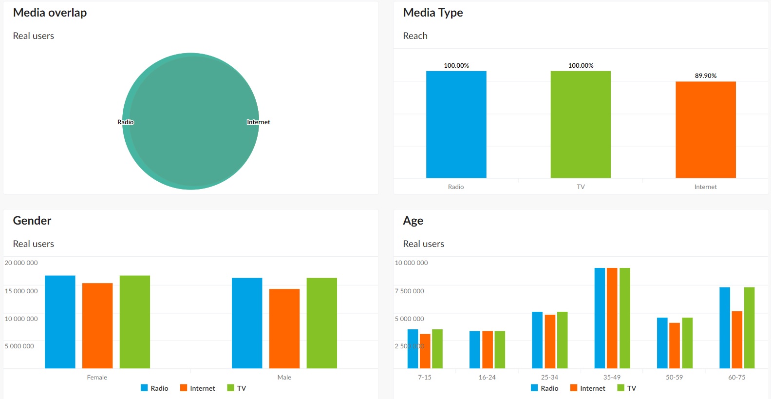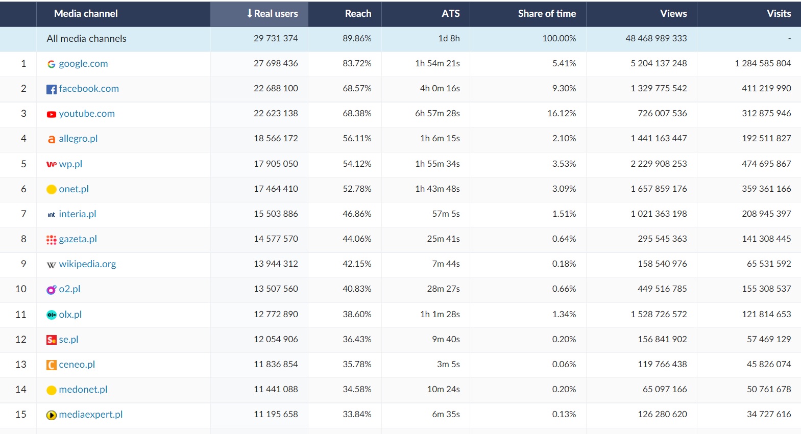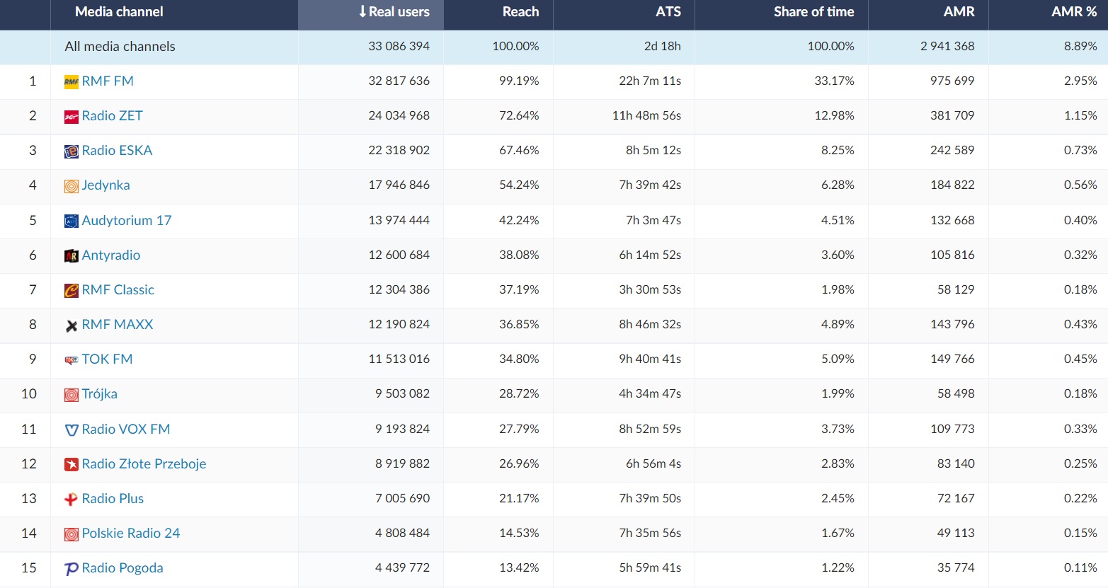 In October 2022, RMF FM (Real Users = 32.8 million; Reach = 99.19%), Radio ZET (Real Users = 24 million; Reach = 72,6%) and Radio ESKA (Real Users = 22,3 mln; Reach = 67,46%) were on the podium of the most listened radio stations in Poland. The longest ATS (Average Time Spent) was recorded by RMF FM, Radio ZET and TOK FM.