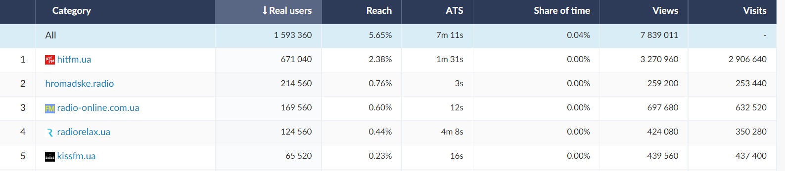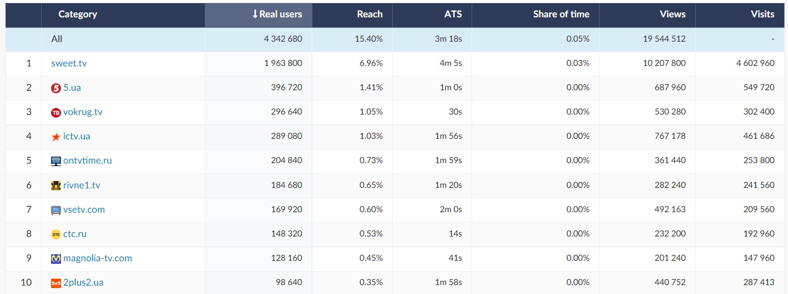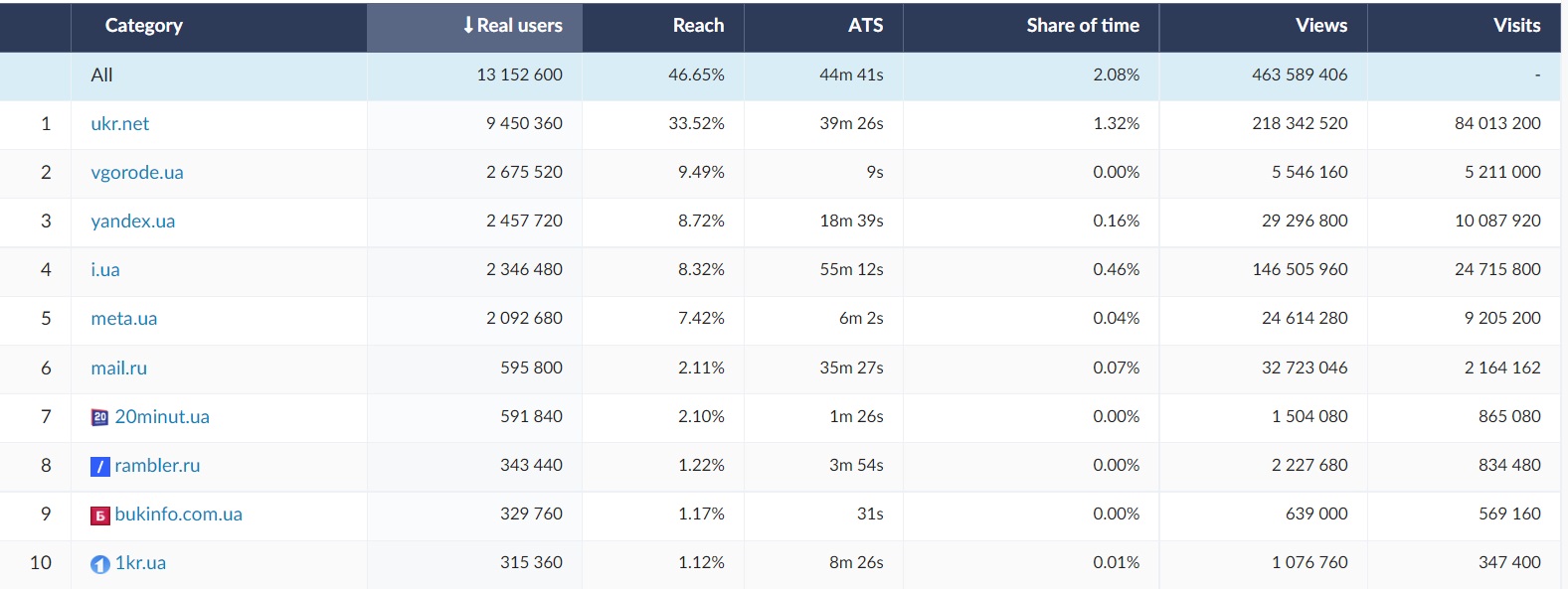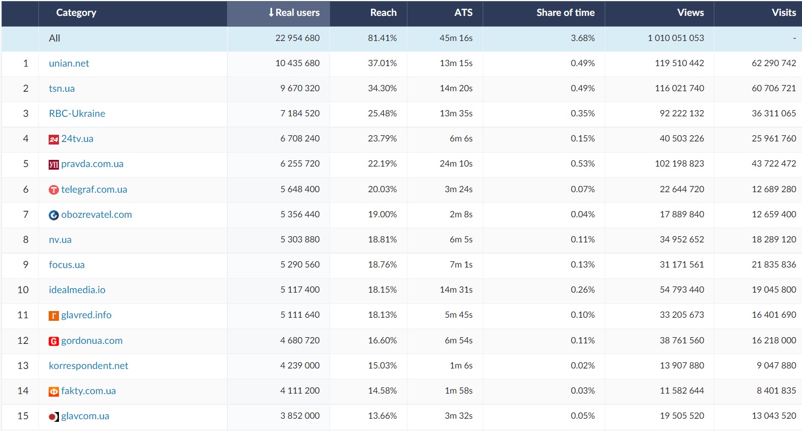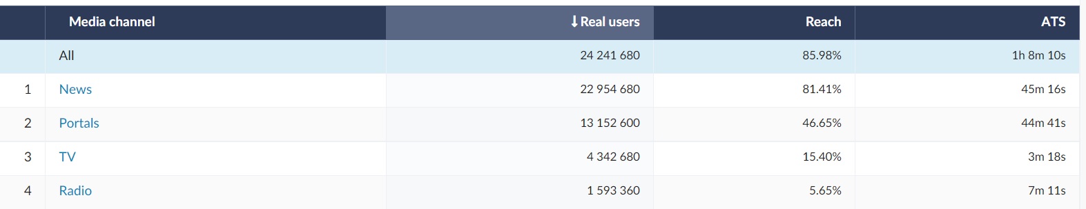 In the case of data analysed for a specific type of media, internet news media (RU=22,9 mln; ATS=45 min) and portals (RU=13,1 mln; ATS = 44 min) were the most searched, dominating over TV and Radio. The same as in the previously analyzed periods, the channels that enable quick finding of specific information have been used most often by Ukrainian Internet and media users.