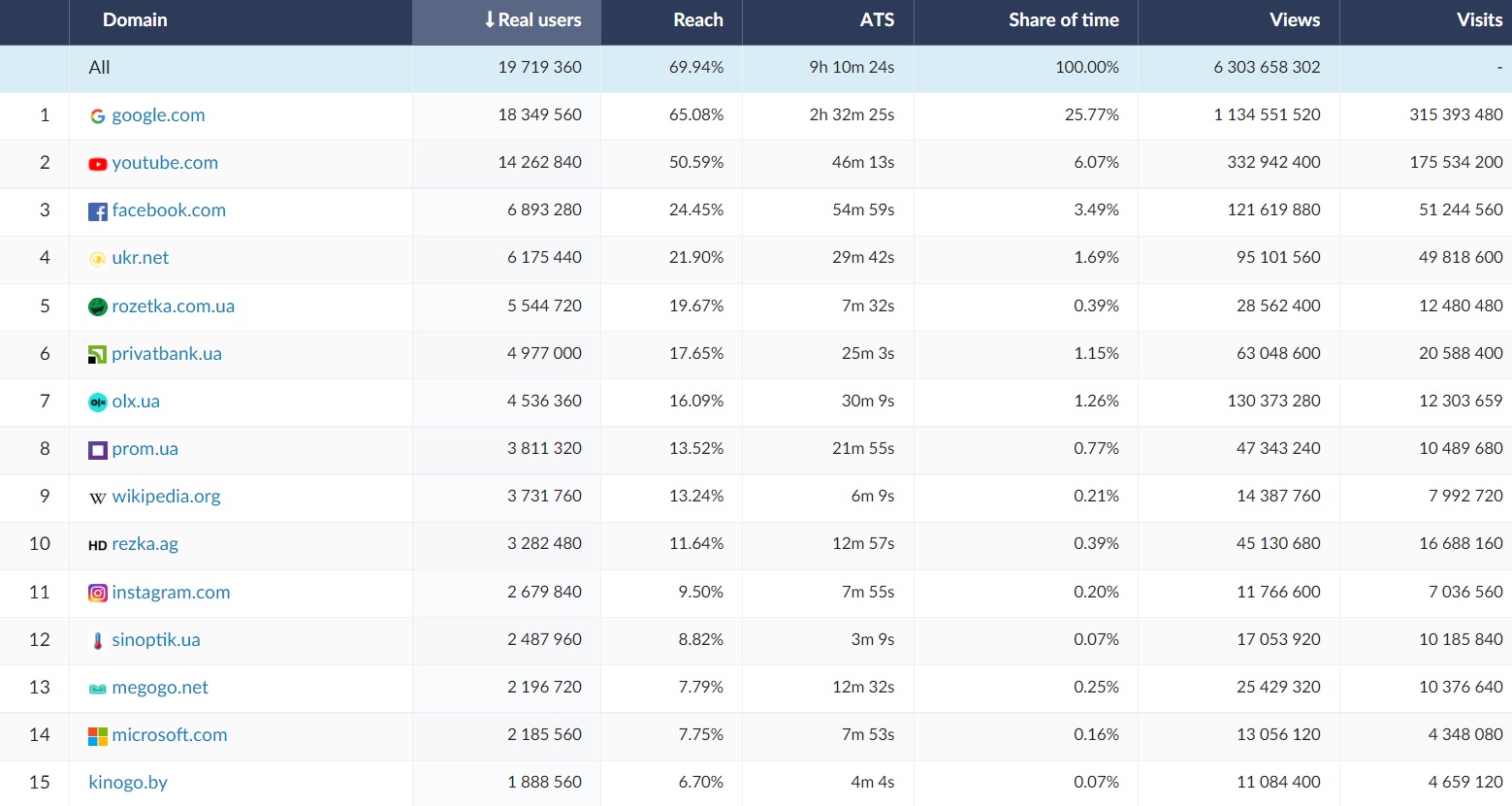 Among the 15 most visited websites and channels in Ukraine, google.com was in the first place (ATS = 2h 32m, RU = 18,3 mln). The 15 websites most frequently viewed by Ukrainians the same as in previously analysed month include social media websites (facebook.com, instagram.com), as well as news,TV and weather services and internet websites. The website of the largest commercial bank in Ukraine was also frequently used - privatbank.ua (ATS = 25 min, RU = 4,97 mln). Ukrainian Internauts eagerly visited Internet Encyclopedia - Wikipedia (RU = 3,7 mln). In December 2022 Ukrainian internet users visited online shopping platforms such as olx.ua, prom.ua and rozetka.com.ua. Film platform such as rezka.ag were also among 15 most popular websites in December.