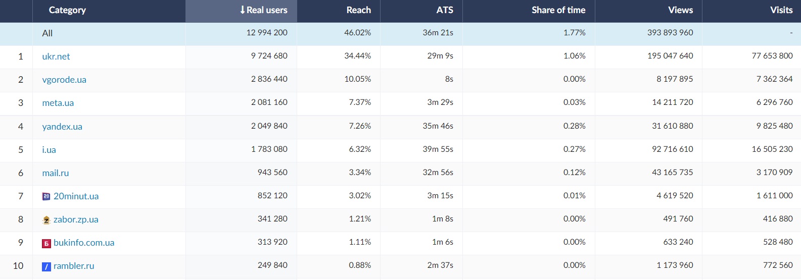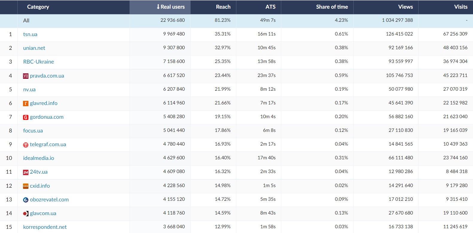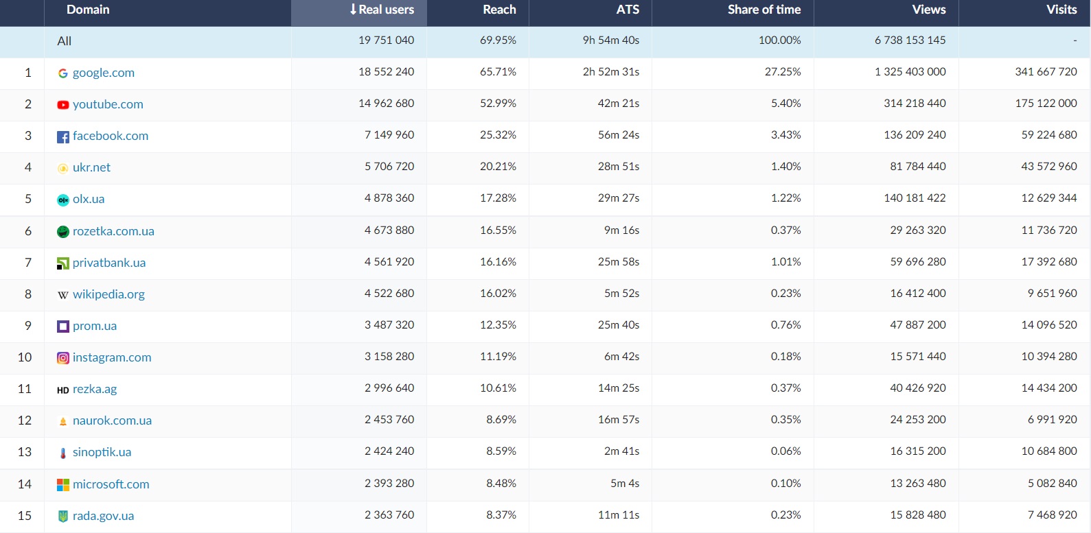 Among the 15 most visited websites and channels in Ukraine, google.com was in the first place (ATS = 2h 52m, RU = 18,5 mln). The 15 websites most frequently viewed by Ukrainians include social media websites (facebook.com, instagram.com), as well as news,TV and weather services and internet websites. The website of the largest commercial bank in Ukraine was also frequently used - privatbank.ua (ATS = 25 min, RU = 4,5 mln). Ukrainian Internauts eagerly visited educational websites such as Wikipedia (RU = 4,5 mln) and naurok.com.ua (RU = 2,4 mln). In November 2022 Ukrainian internet users visited also online shopping platforms such as olx.ua, prom.ua and rozetka.com.ua. Film platform such as rezka.ag were also among 15 most popular websites in November.