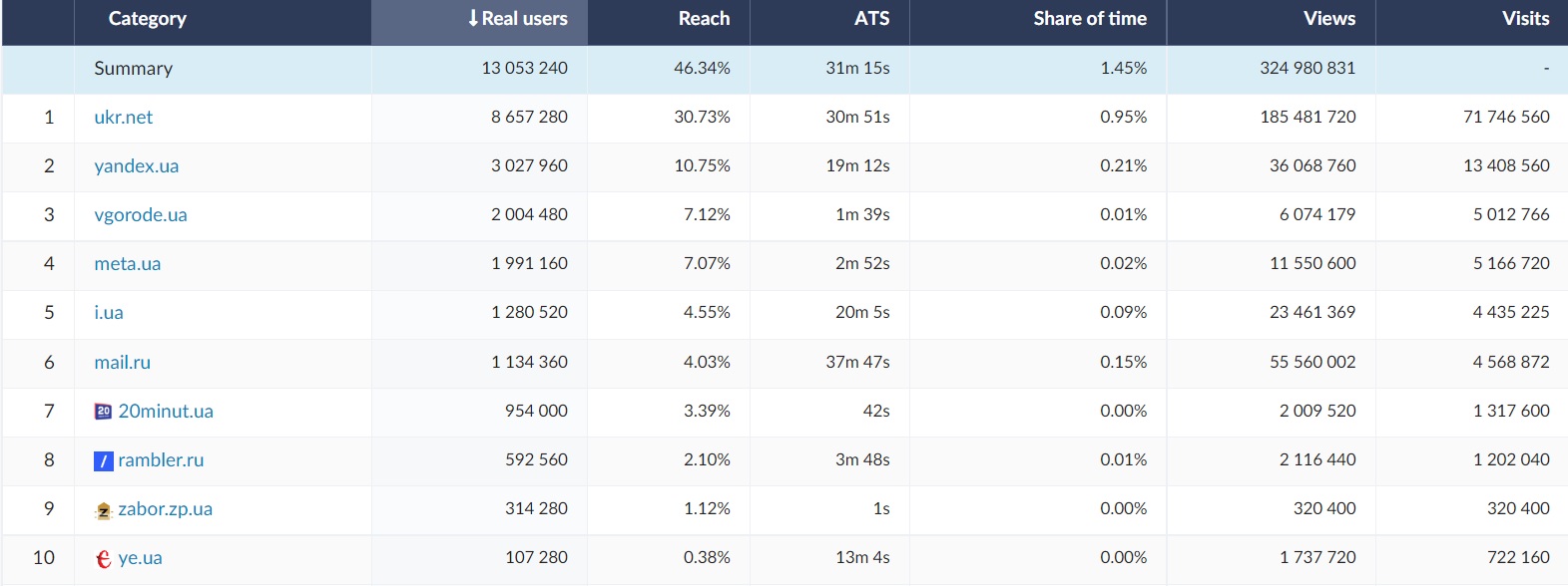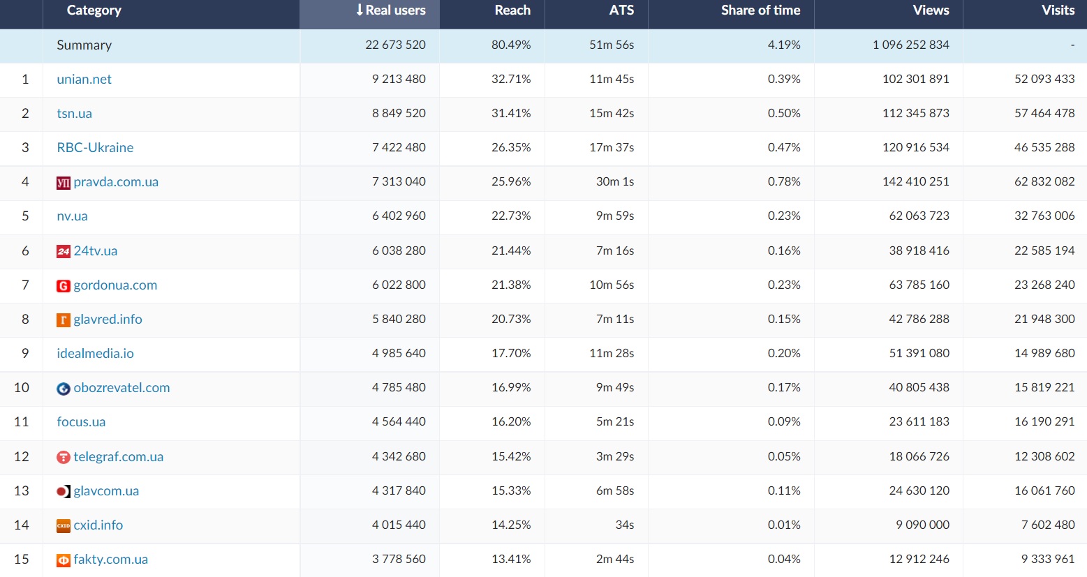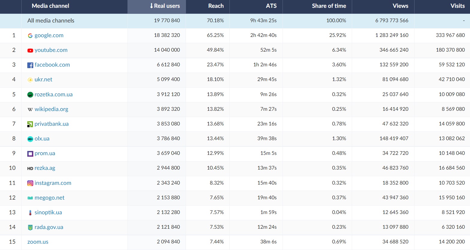 Among the 15 most visited websites and channels in Ukraine, Google was in the first place (ATS = 2h 42m, RU = 18,4 mln). The 15 websites most frequently viewed by Ukrainians include social media websites (facebook.com, instagram.com), as well as news,TV and weather services and internet websites. The website of the largest commercial bank in Ukraine was also frequently used - privatbank.ua (ATS = 23 min, RU = 3,8 mln) and Wikipedia (place 6, RU = 3,9 mln). In October 2022 Ukrainian Internauts visited also online shopping platforms such as olx.ua, prom.ua and rozetka.com.ua. Film platforms rezka.ag and megogo.net were also among 15 most popular websites in October.