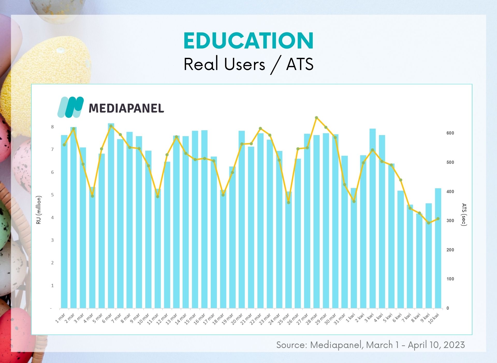 Less interest in pages from the "Education" category, i.e. including electronic diaries, could be observed as early as Thursday before Easter. The day with a record low number of RUs was Saturday before Christmas (4.2 million), while Internet users spent the least amount of time on education websites on Easter (less than 5 minutes). For comparison - the average RU and ATS indicators for March in this category are 7.1 million and 8 minutes and 50 seconds, respectively).
