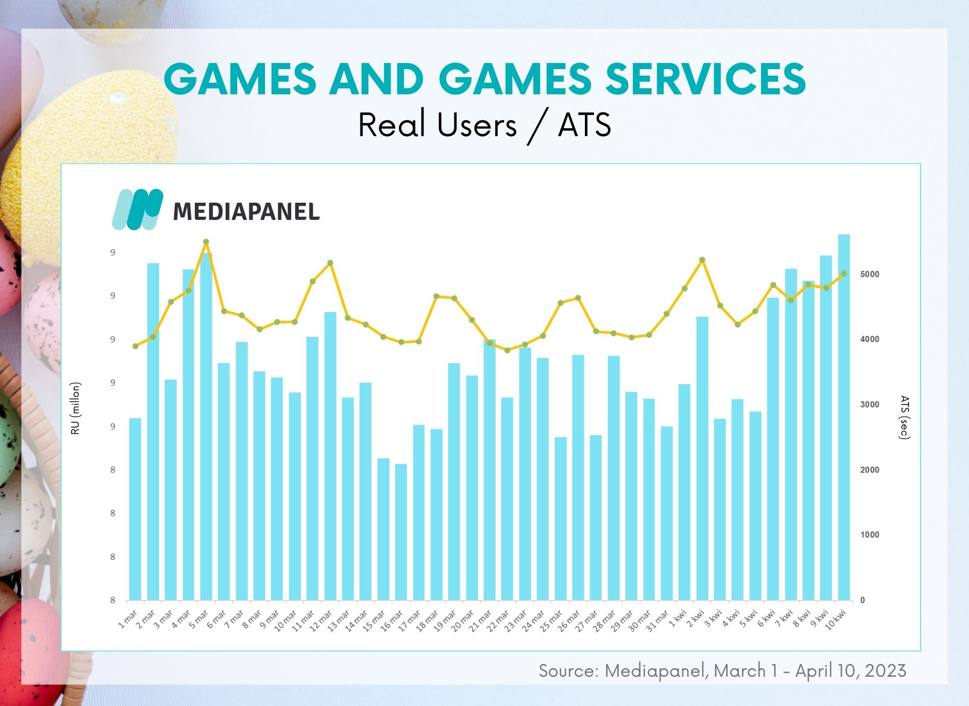 The second category in which an increased number of users could be noticed during the holiday season was "Games and gaming websites". Throughout the holiday long weekend, starting on Thursday, RUs remained above the March average of 8.8 million, with a record high of 9.5 million on Easter Monday. In the period from April 6-10, pages in this category were viewed on average by 9.3 million people per day, who spent an average of 1 hour 20 minutes and 14 seconds on them.