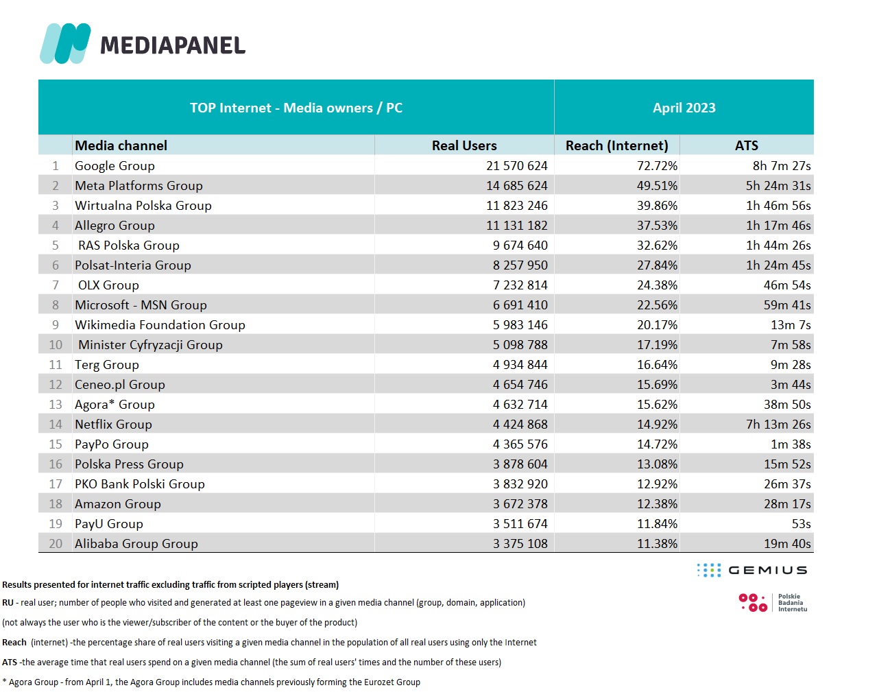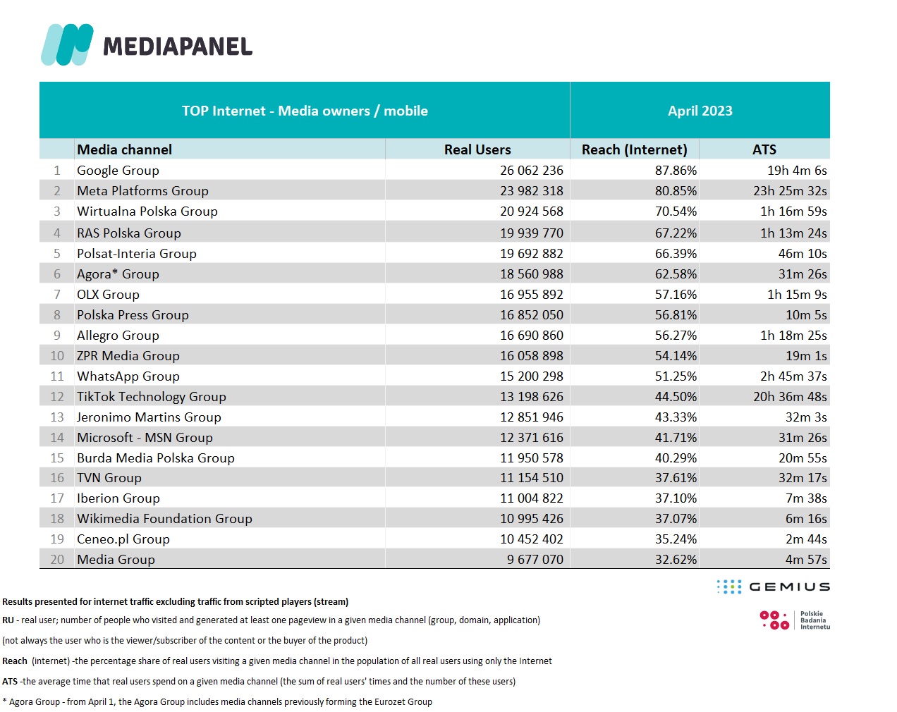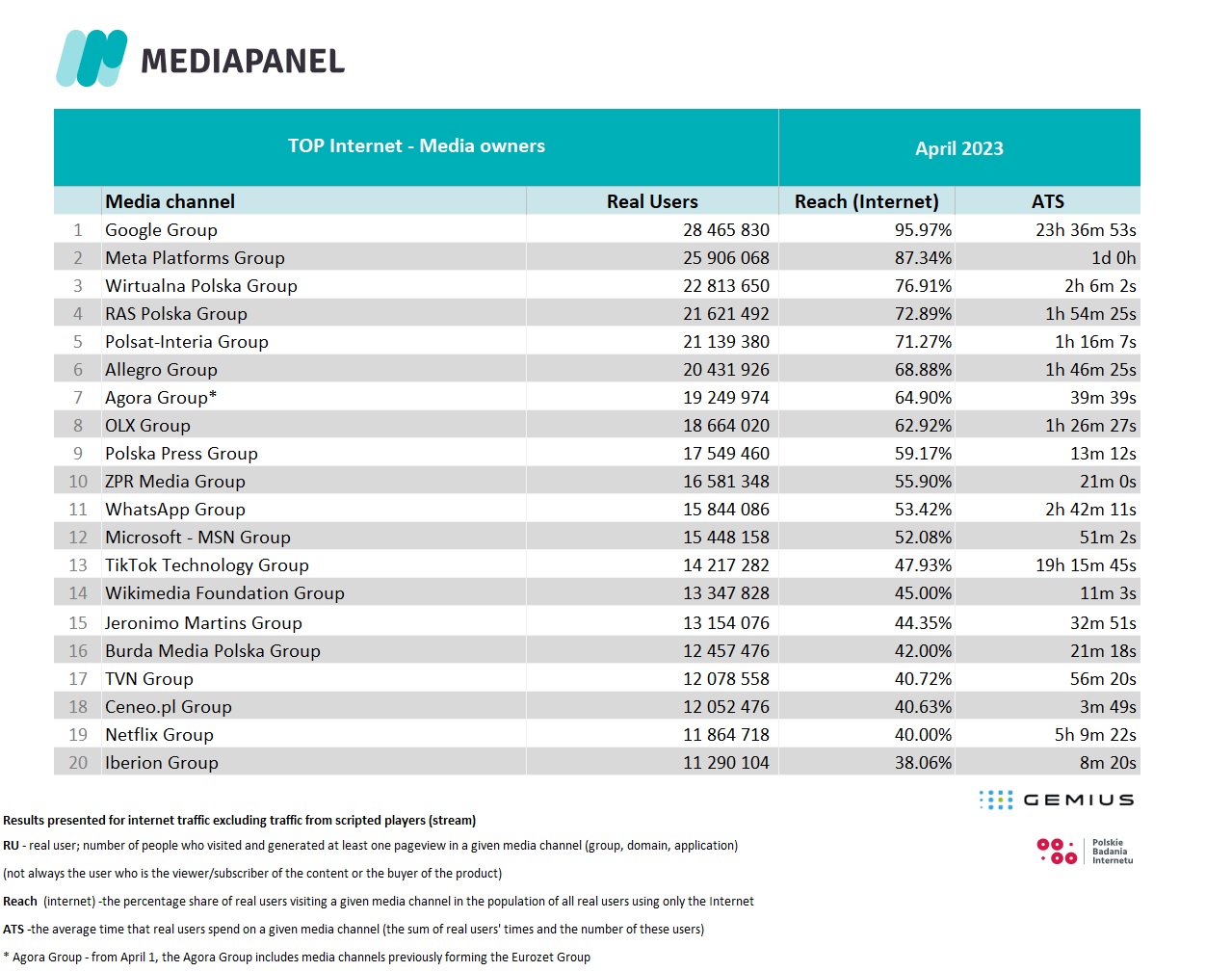 Starting with the results for December 1, 2022, we added new Media Groups to the study, which consist of previously ungrouped media channels. Grouping is carried out in accordance with the new Grouping Regulations. As a result of the change, new groups have been added to the lists below, including: the Netflix Group, the Meta Platforms Group, the Jeronimo Martins Group and the InPost Group, and the YouTube Group, previously presented separately, is now part of the Google Group. You can read more about new Grouping Regulations in polish here.