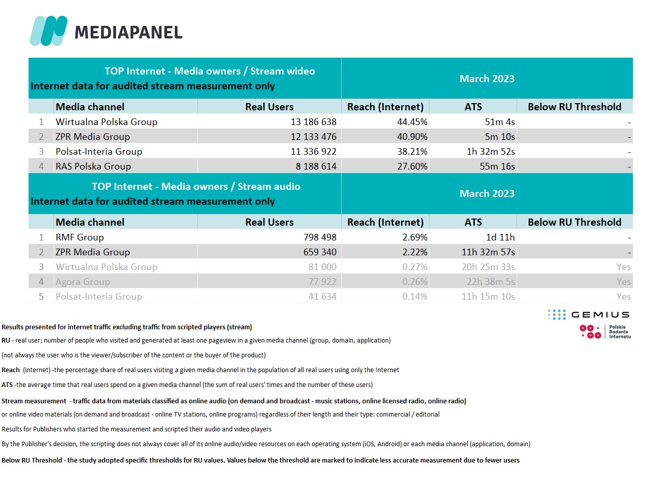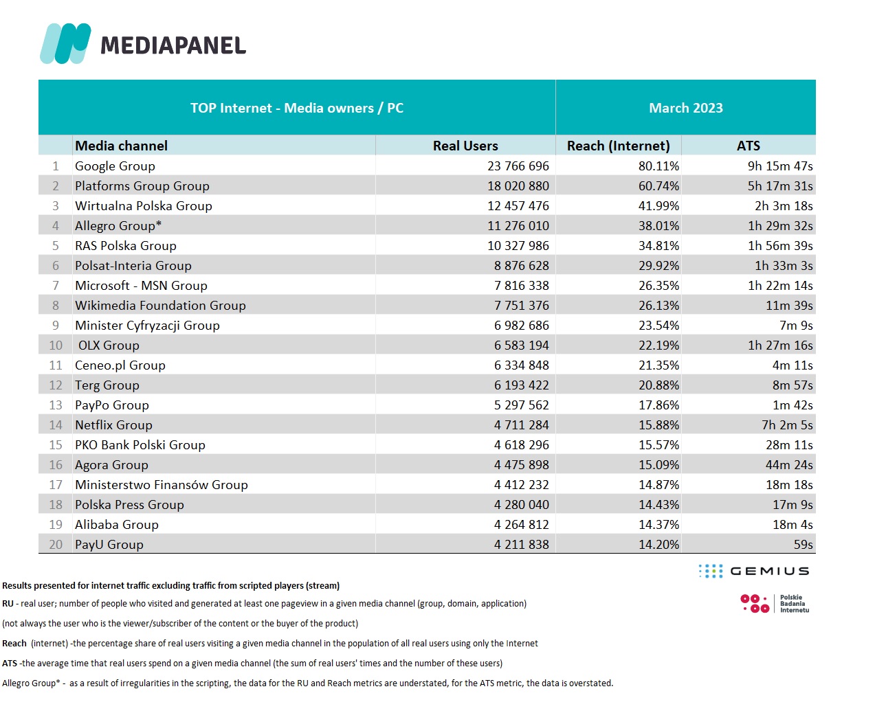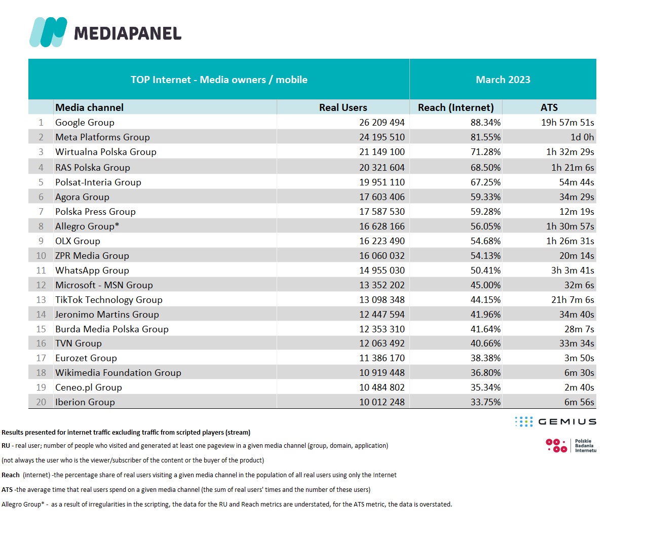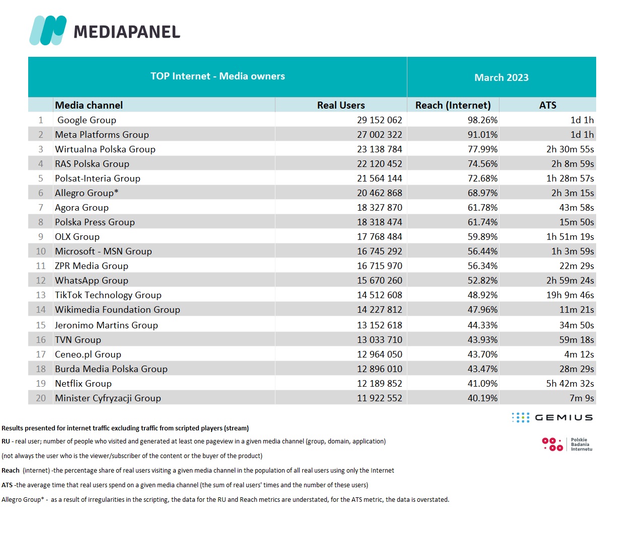 Starting with the results for December 1, 2022, we added new Media Groups to the study, which consist of previously ungrouped media channels. Grouping is carried out in accordance with the new Grouping Regulations. As a result of the change, new groups have been added to the lists below, including: the Netflix Group, the Meta Platforms Group, the Jeronimo Martins Group and the InPost Group, and the YouTube Group, previously presented separately, is now part of the Google Group. You can read more about new Grouping Regulations in polish here.