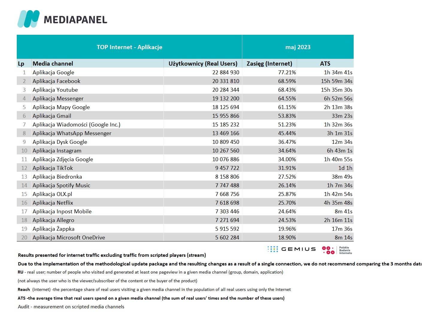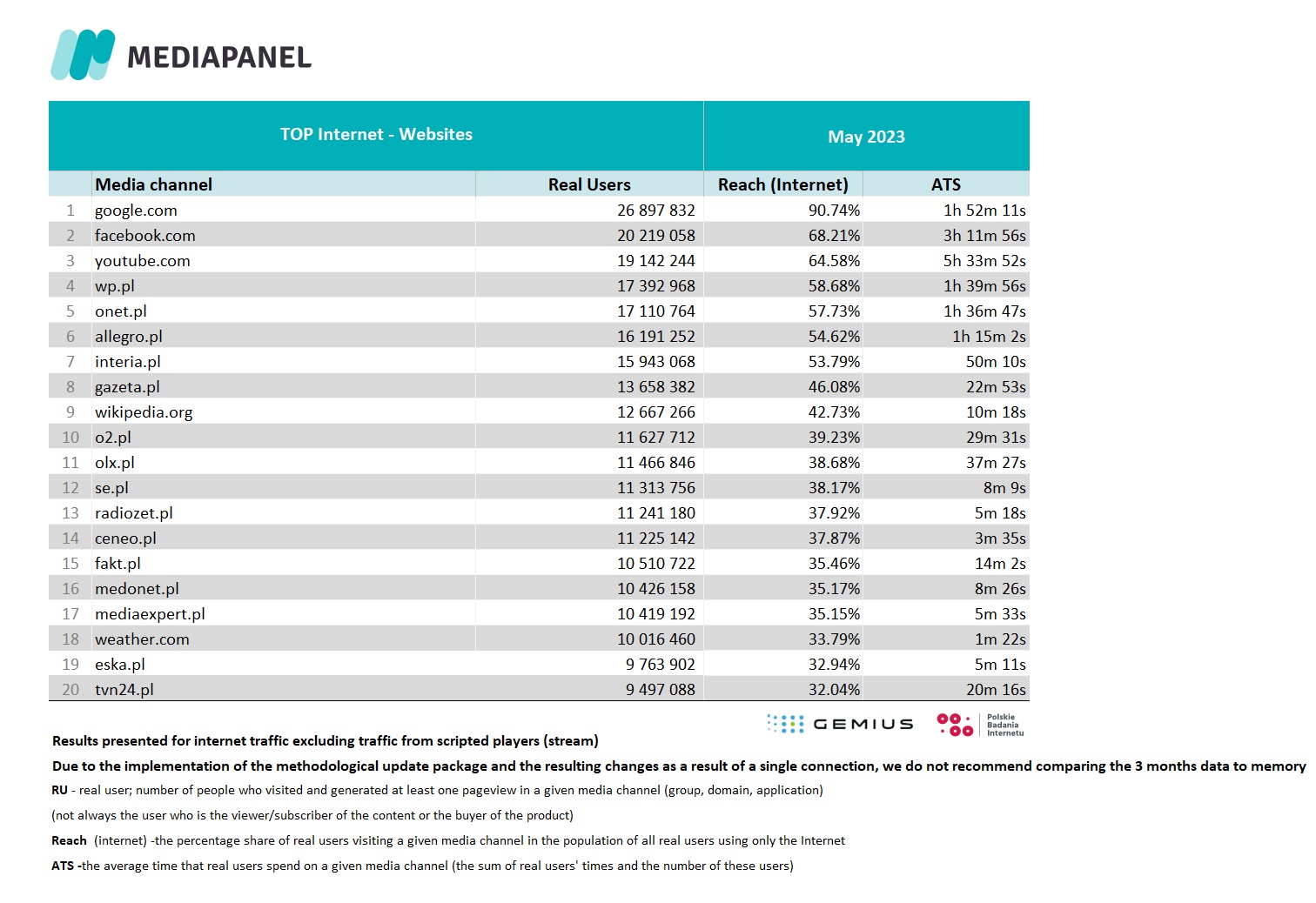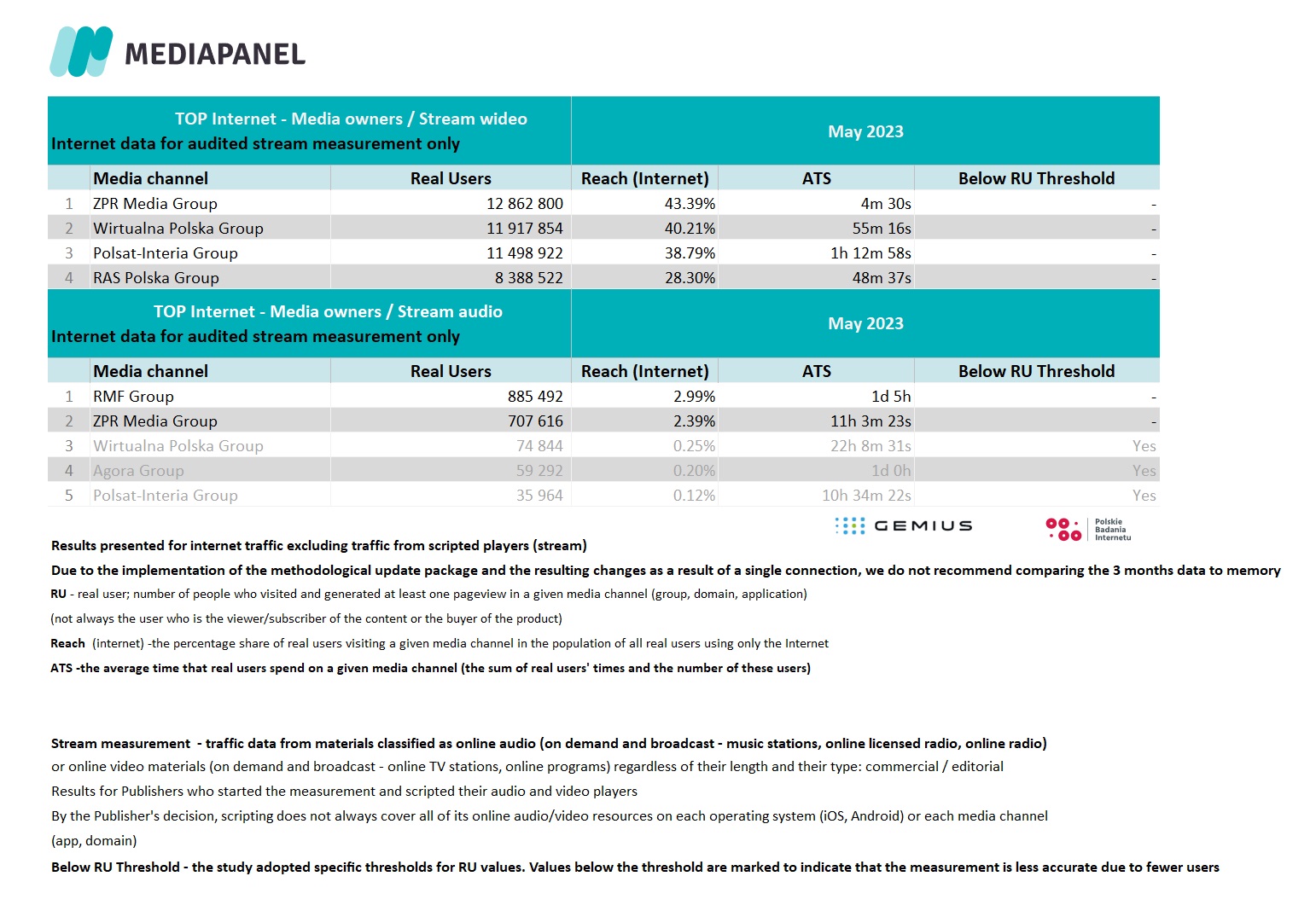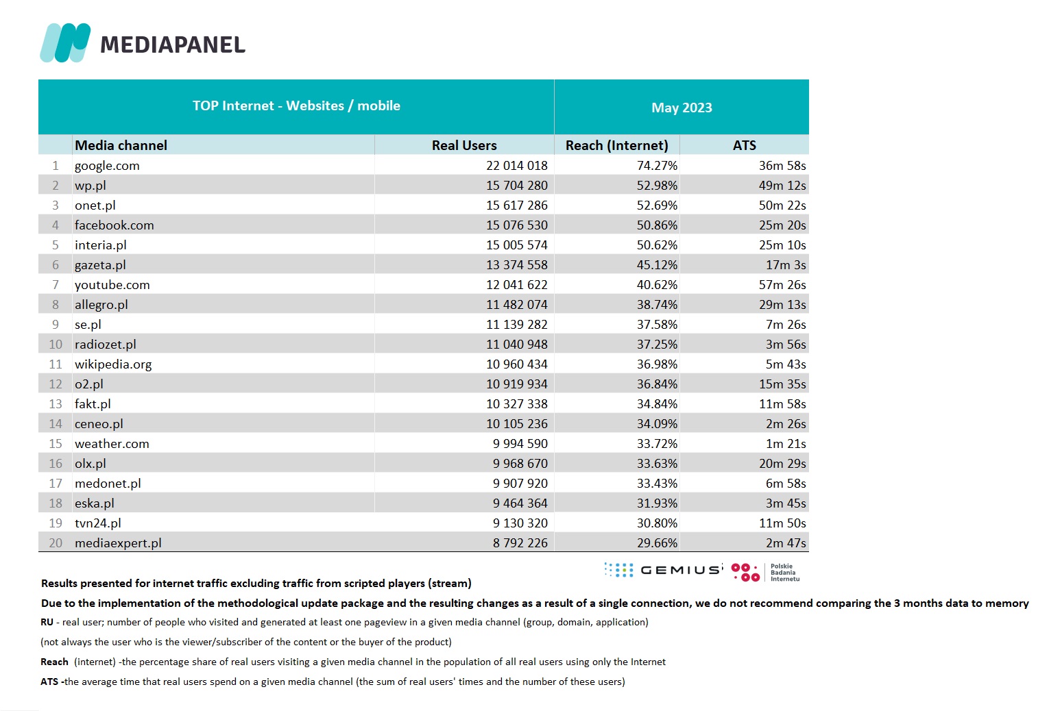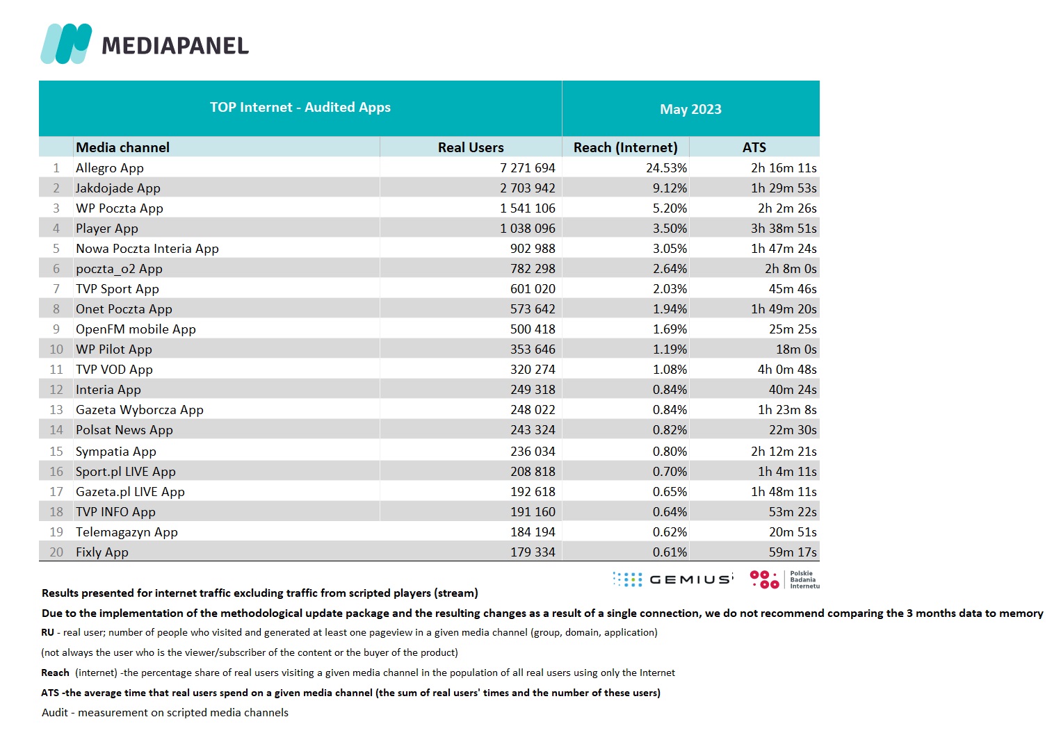 We would like to remind you that on April 24, 2023, we implemented a package of important methodological updates aimed at even better mapping of the real situation on the online market in the data. Updates made may affect some results (e.g. RU, views, time), especially for unaudited domains and audited applications. Therefore, it is important to remember that changes in results (e.g. noticeable decreases or increases compared to the previous month) may be the result of methodological updates, not the health of individual domains or applications. Therefore, we do not recommend comparing the results after the update with those before the implementation, and in case of doubts as to the interpretation of the data, please contact us.