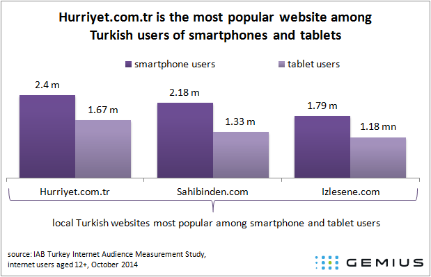 October 2014 data show that Hurriyet.com.tr is visited by over a quarter of smartphone users (2.40m) and one-third of tablet users (1.67m). Sahibinden.com is browsed by every fourth internet user on a smartphone (2.18m) and tablet (1.33m). The website Izlesene.com is entered by one-fifth of smartphone (1.79m) and one-fourth of tablet (1.18m) users.