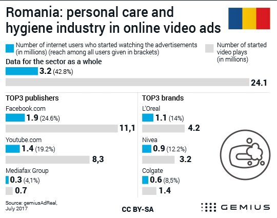 In July, L'Oréal was the leading brand on the Internet in Romania in terms of broadcasting frequency The French brand’s product spots were broadcast almost 4.2 million times and viewed by 14 percent of Internet users. Nivea was the second most advertised brand in July. Its products were promoted by spots that were displayed 3.2 million times reaching 12 percent of Internet users. Colgate achieved third place in the brand ranking. The brand’s commercials were displayed 1.4 million times and viewed by eight percent of Internet users in Romania.
