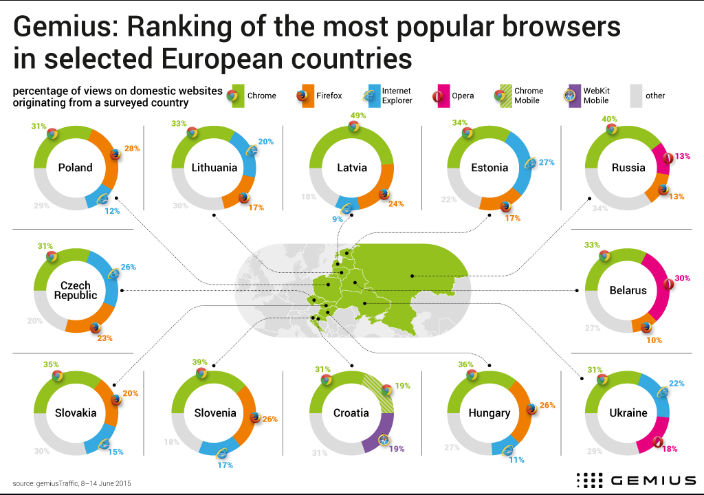 In each of the 12 European countries analysed, internet users view the greatest number of websites using the Chrome browser. Firefox, Internet Explorer, Opera and Chrome Mobile came in second. Check out the latest Gemius infographic for the ranking of the top three browsers in selected countries in Europe.