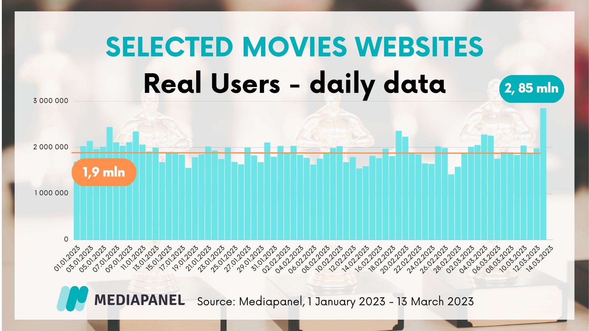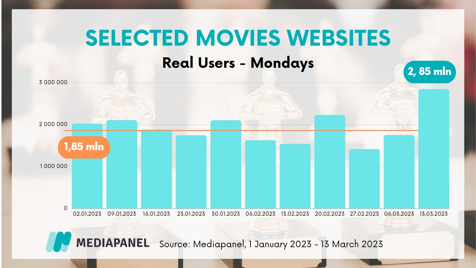 According to the data, in January selected websites were visited by an average of 1.9 million people a day. On Monday, March 13, just after the Oscars ceremony, this number increased by almost a million, to 2.85 million Internet users. An analysis of Mondays alone since the beginning of the year confirms this observation: before Oscar night, websites dedicated to film attracted an average of 1.85 million weekly, which means that they gained 1 million new users the day after this year's gala.