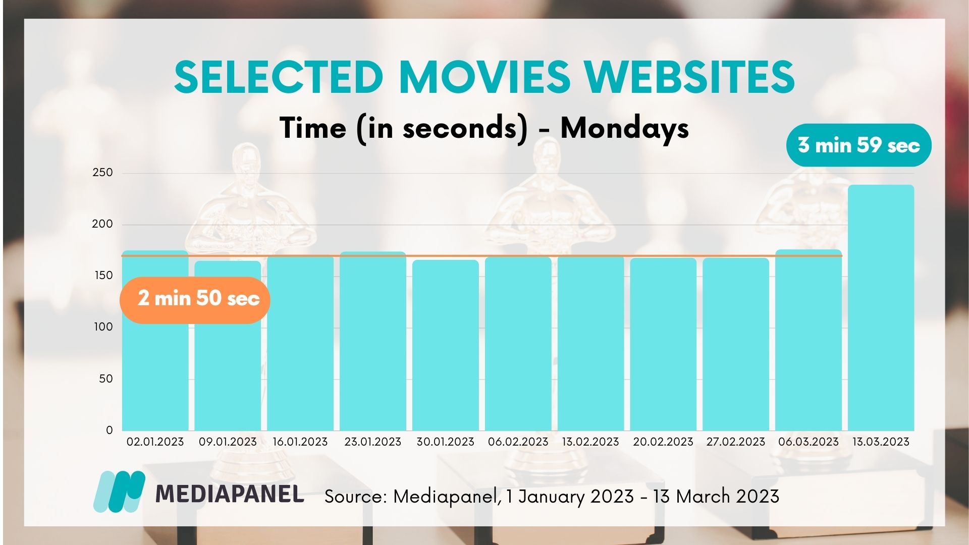 Film topics not only attracted a larger group of people - their involvement in the content also increased and reflected in the time spent on film websites. While on Mondays in 2023 the average user spent 2 minutes 50 seconds on film-related websites, on March 13 he stayed on them for almost 4 minutes.