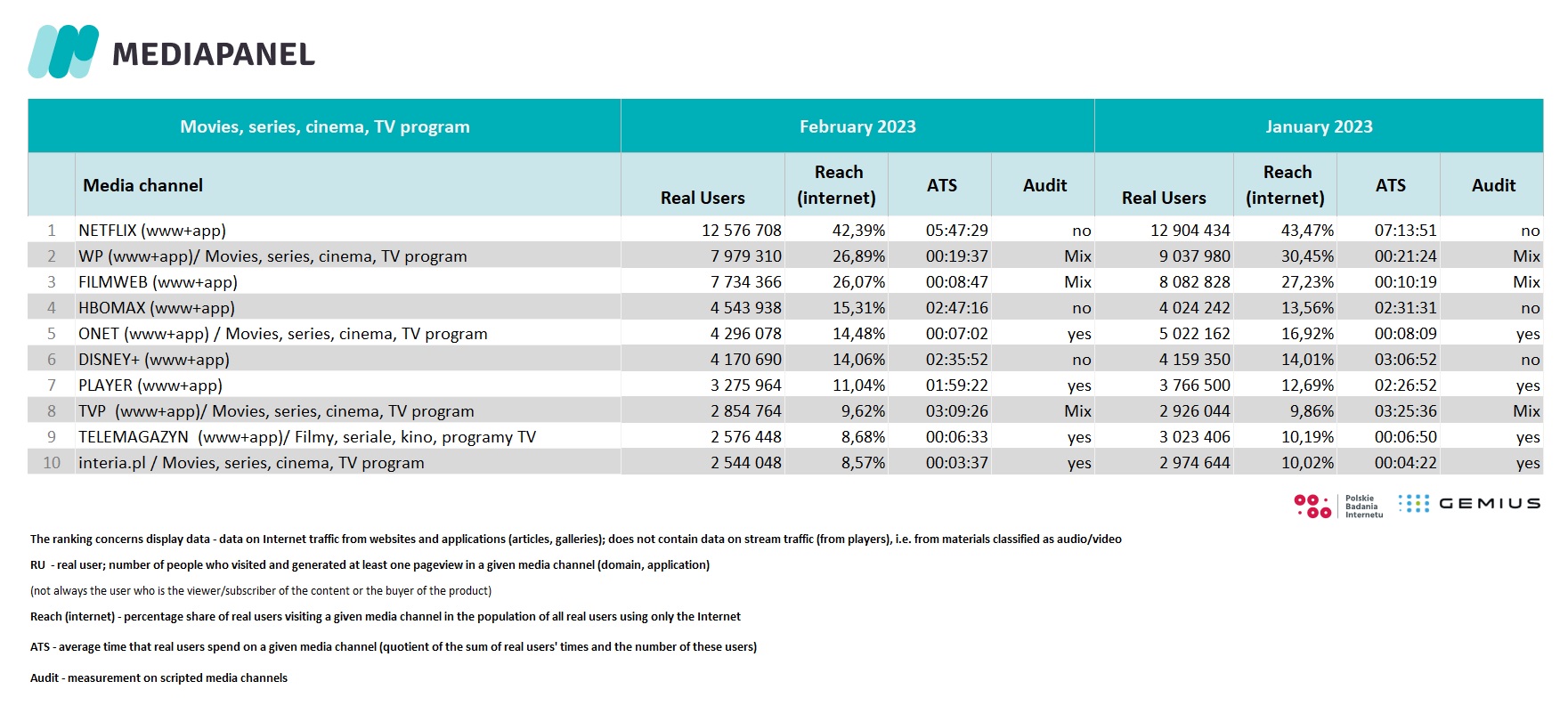 Selected websites from the "Films, series, cinema, TV program" category were analysed by Gemius Polska: noizz.pl - film, eska.pl - cinema, filmweb.pl, interia - film, gazeta.pl - culture, WP - film, onet.film . A period of 2.5 months was analyzed (from January 1 to March 13, 2023).