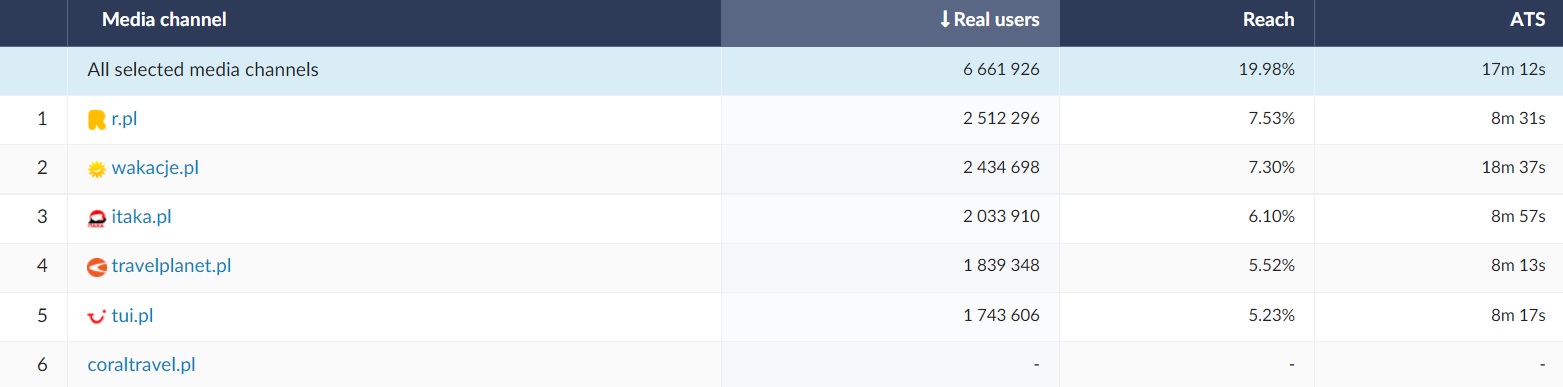 Data from the Gemius Mediapanel study was analyzed for the period from June 1 to July 13, 2022. The list includes two of the largest holiday brokers in Poland, offering an overview of offers from various travel agencies on their websites - travelplanet.pl and wakacje.pl. Data for the following travel agencies were also analyzed: Rainbow (r.pl), Coral Travel (coraltravel.pl), TUI (tui.pl) and Itaka (itaka.pl).