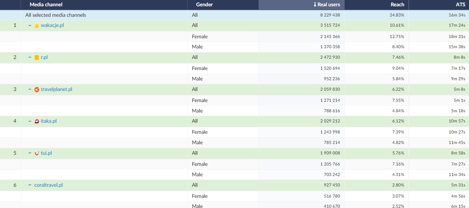 When booking their foreign holidays, Poles willingly use the help of travel brokers. The most popular in the ranking was the wakacje.pl website, which on June 13 achieved the highest number of Real Users - over 220,000 and over 3.5 million of Real Users in the entire analyzed period. This broker also recorded the longest ATS * - almost 17.5 minutes. Rainbow travel agency was second on the podium (RU = 2.5 million; ATS = 8 min). The podium is closed by the Travel Planet broker, which in the analyzed period recorded over 2 million RU and ATS = over 5 minutes. The analyzed data show that women browsed the websites of travel agencies and brokers much more often than men. It can be concluded that they more often deal with the choice of holiday destinations for the family and the organization and purchase of foreign trips.