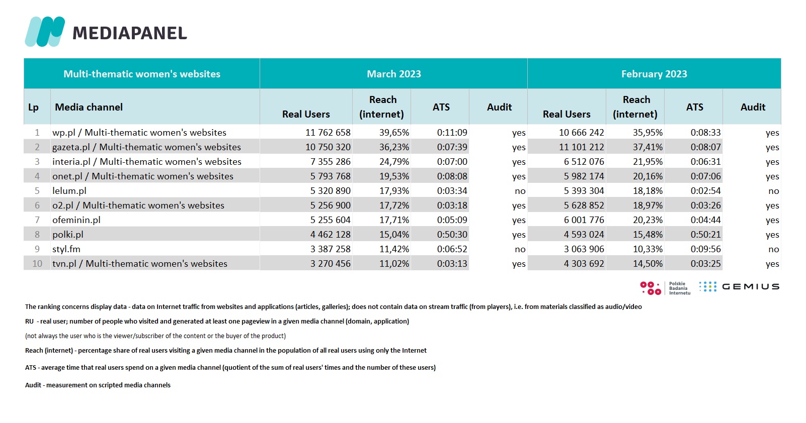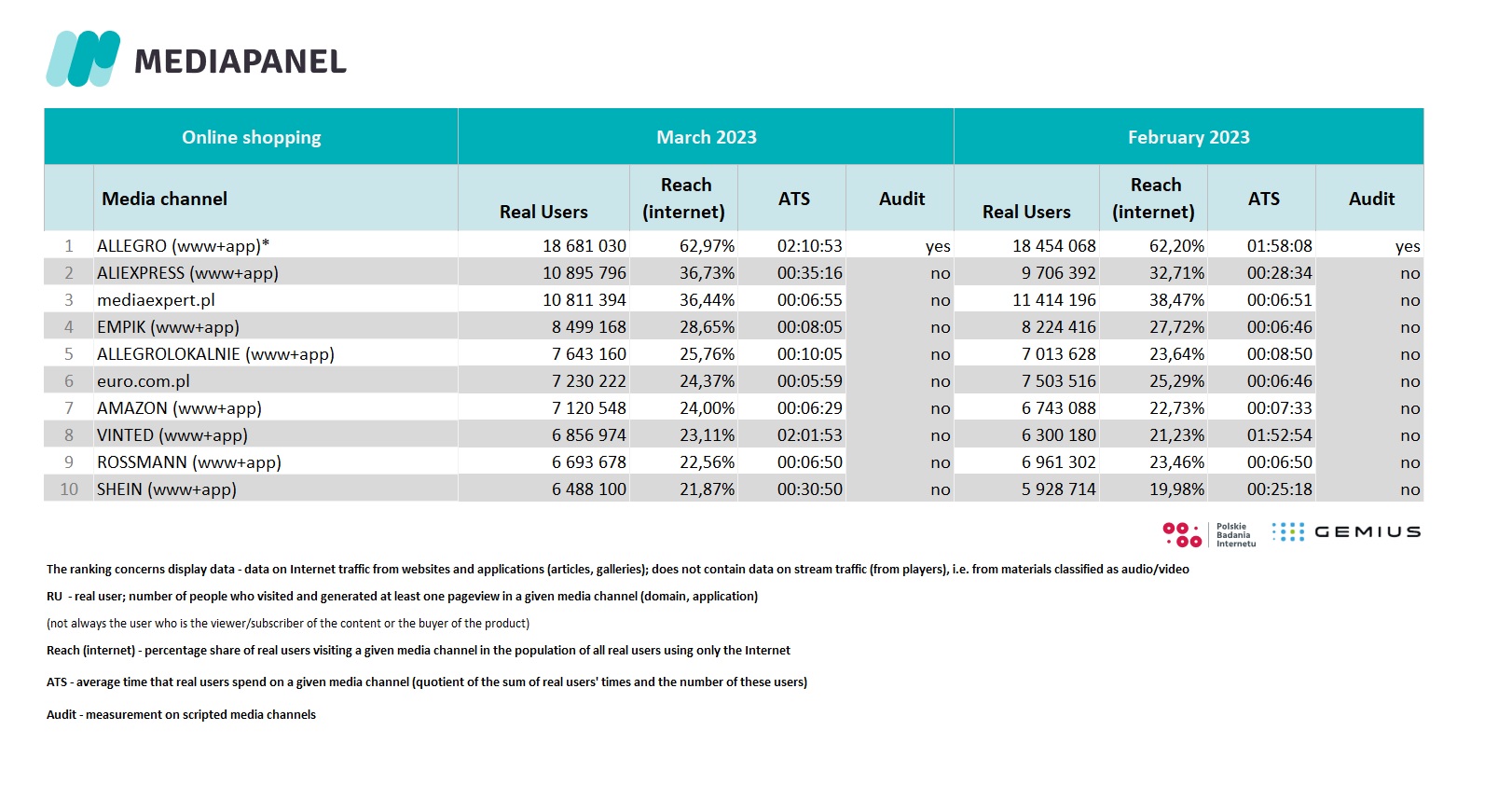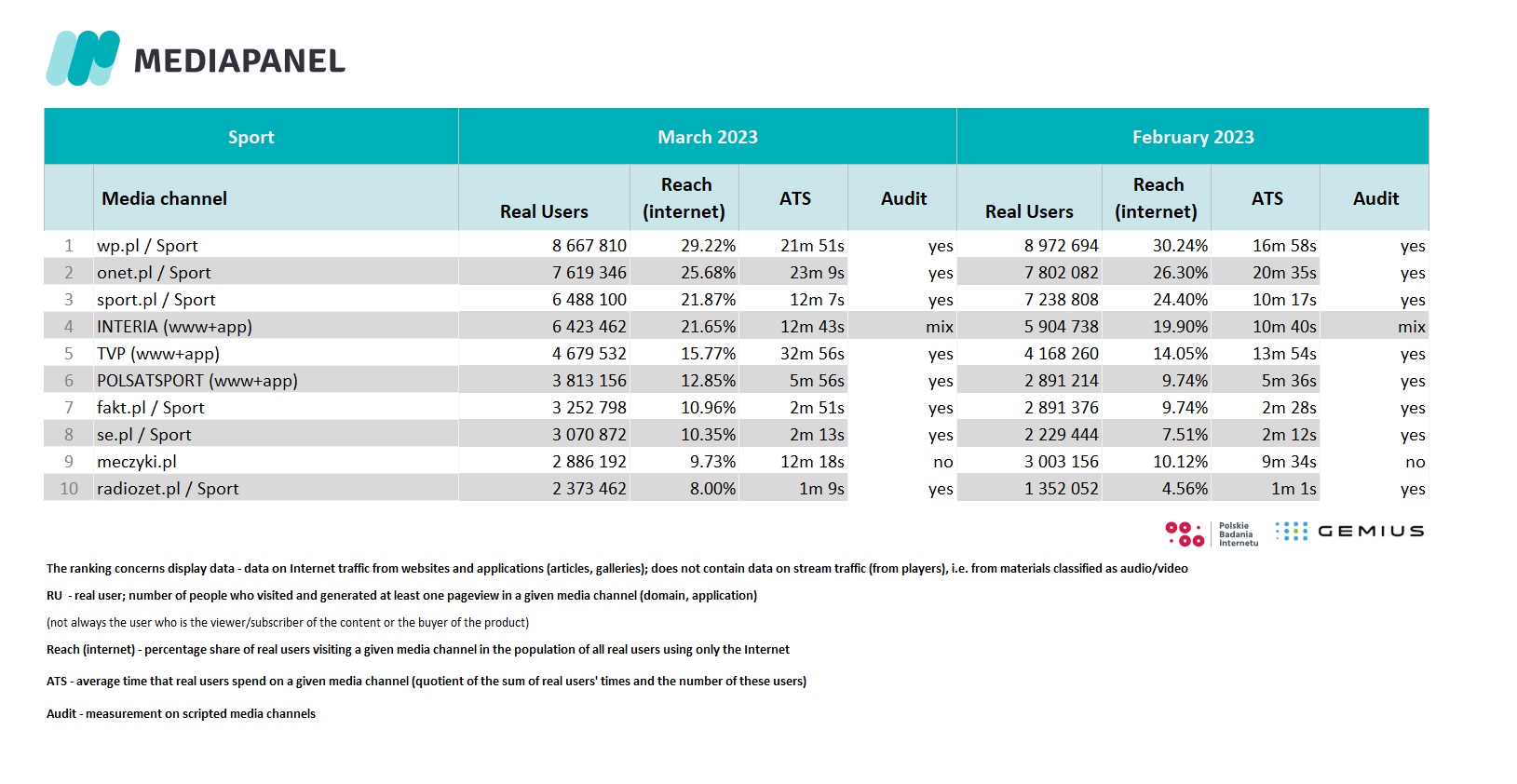 Mediapanel is the first cross-media study in Poland based on a single source. The study combines site-centric measurement (measurement scripts at the site and application level) and user-centric measurement (panelists' behavior). In the production of data, we use proprietary, internationally recognized methodologies and algorithms. The Mediapanel study provides a complete and reliable picture of the Polish online market. It offers the possibility of analyzing and comparing the viewership of websites, applications and streaming materials on various types of devices, optimization of advertising budgets, comparison of traffic on desktops and laptops at home (PC-home) and at work (PC-work), as well as determining the position of the entity and its competition.