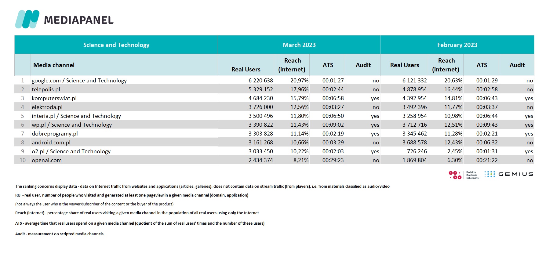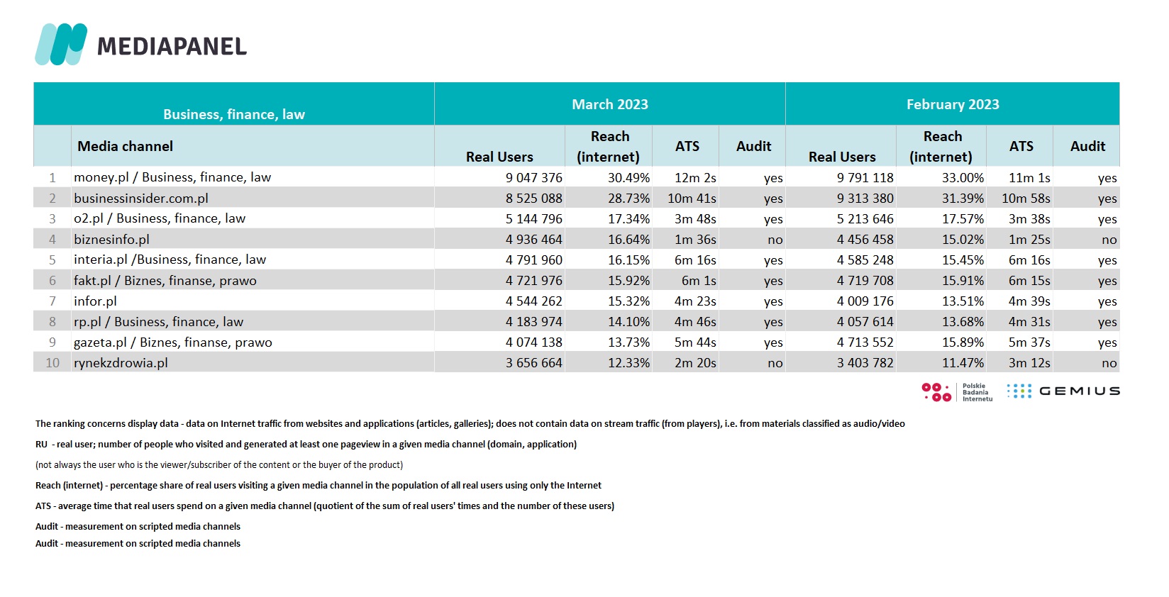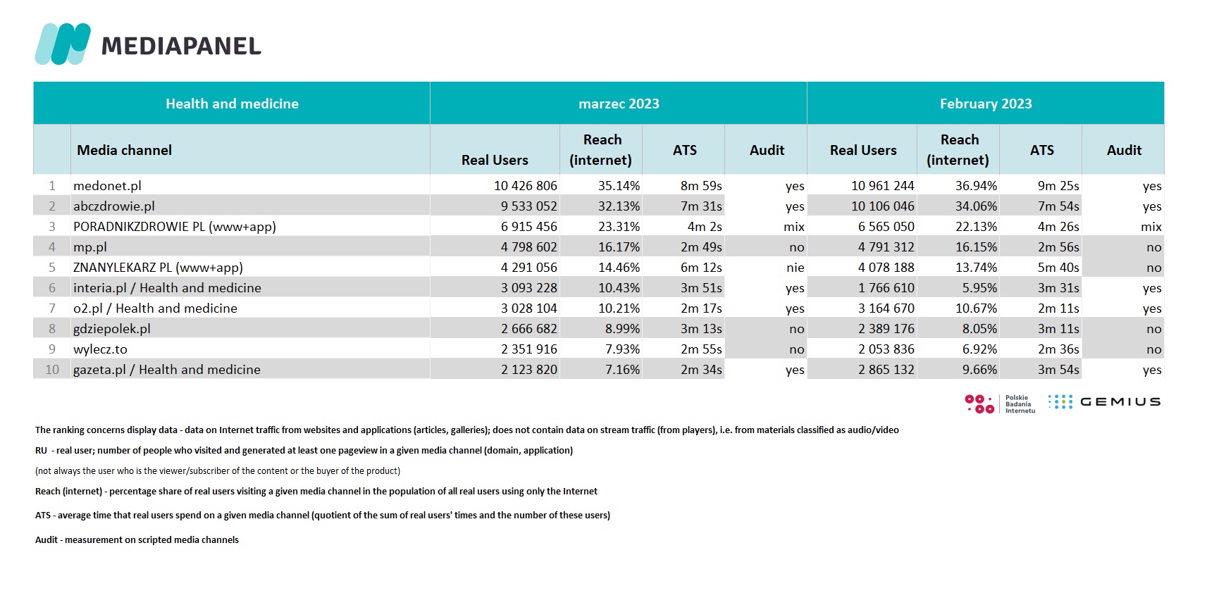 Mediapanel is the first cross-media study in Poland based on a single source. The study combines site-centric measurement (measurement scripts at the site and application level) and user-centric measurement (panelists' behavior). In the production of data, we use proprietary, internationally recognized methodologies and algorithms. The Mediapanel study provides a complete and reliable picture of the Polish online market. It offers the possibility of analyzing and comparing the viewership of websites, applications and streaming materials on various types of devices, optimization of advertising budgets, comparison of traffic on desktops and laptops at home (PC-home) and at work (PC-work), as well as determining the position of the entity and its competition.