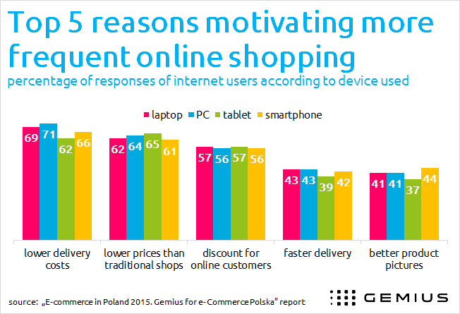 Owners of online shops often wonder what would cause internet users to shop online more often. The answer can be found in the latest report on the e-commerce market. As it turns out, respondents usually mentioned lower delivery costs – this was the response given by as many as 71 per cent of desktop users, 69 per cent of laptop users, 66 per cent of smartphone users and 62 per cent of tablet users. Regardless of the device used, most respondents also cited lower prices than traditional shops and discounts for online customers.