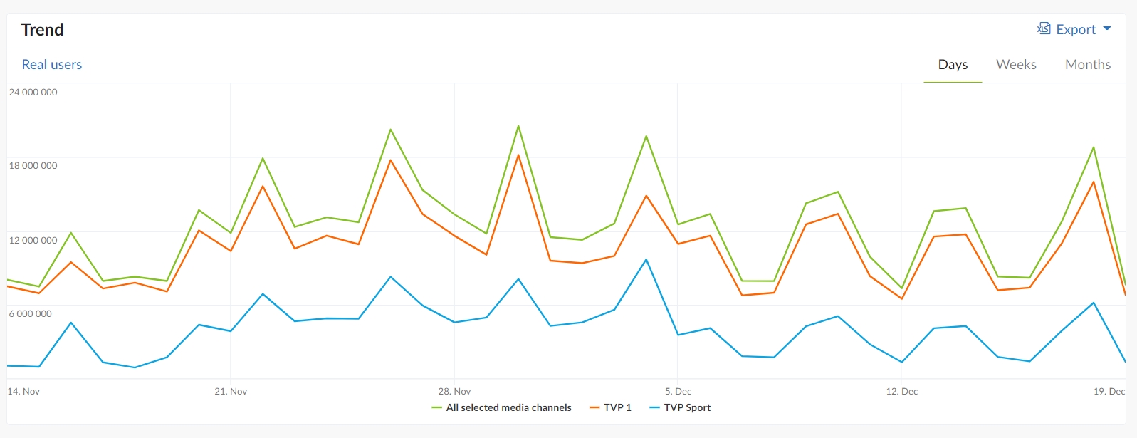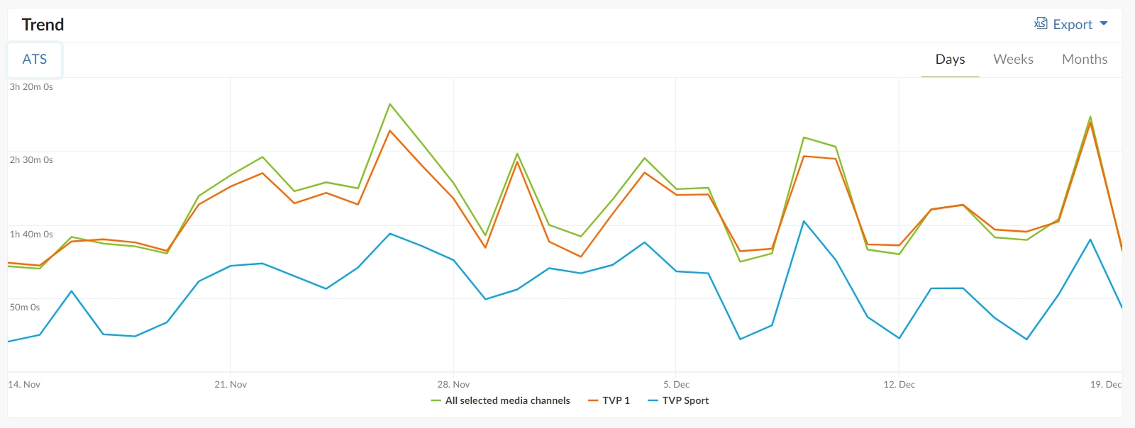 The highest ATS rate for the analyzed channels was recorded on November 26, when it amounted to 3 hours. 2 minutes and 18 seconds The second day with the longest average time spent on TVP1 and TVP Sport was December 18, the day the championship ended (2 hours 53 minutes and 45 seconds).